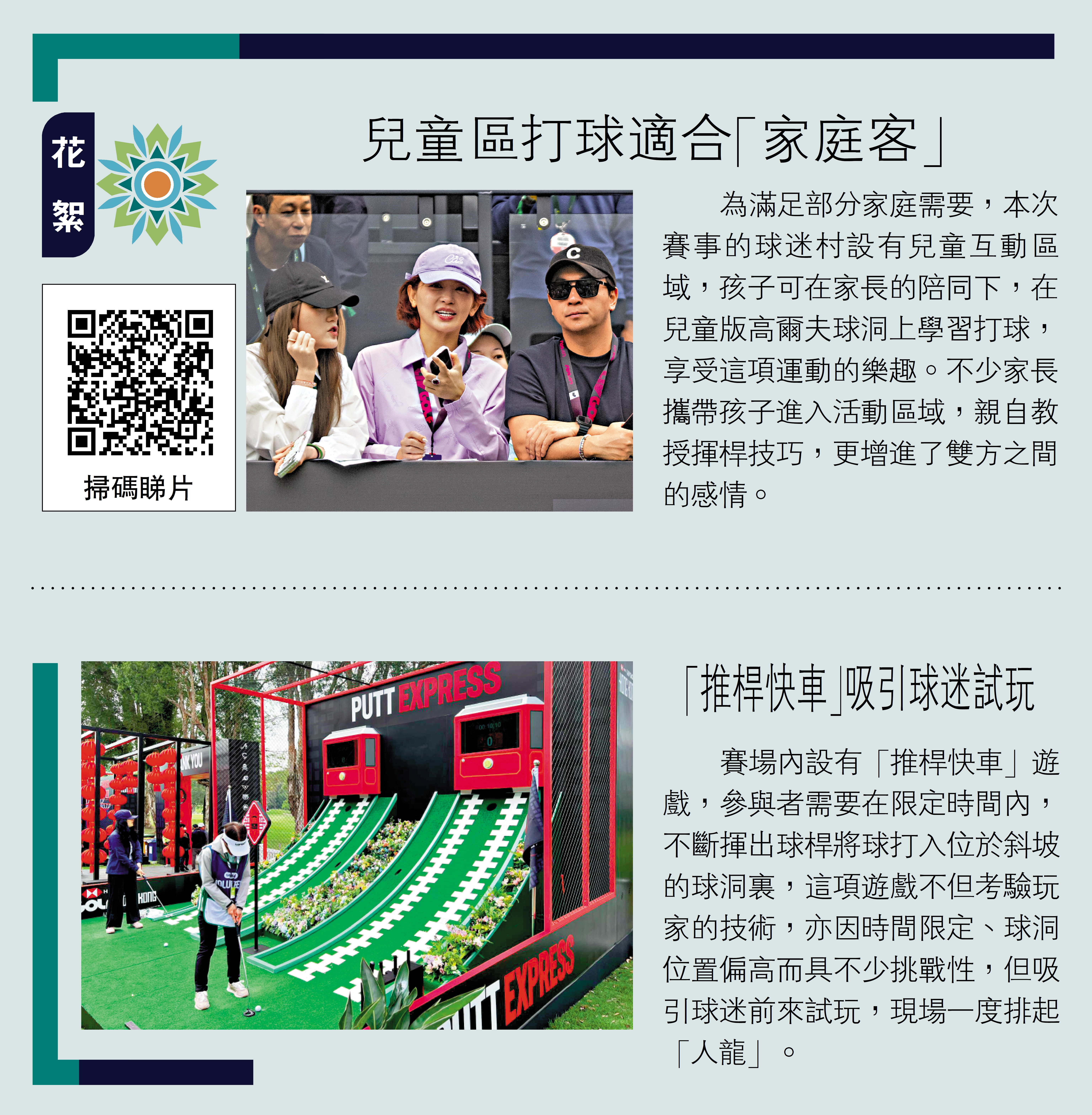 為滿足部分家庭需要,本次賽事的球迷村設有兒童互動區域,孩子可在家長的陪同下,在兒童版高爾夫球洞上學習打球,享受這項運動的樂趣。不少家長攜帶孩子進入活動區域,親自教授揮桿技巧,更增進了雙方之間的感情。