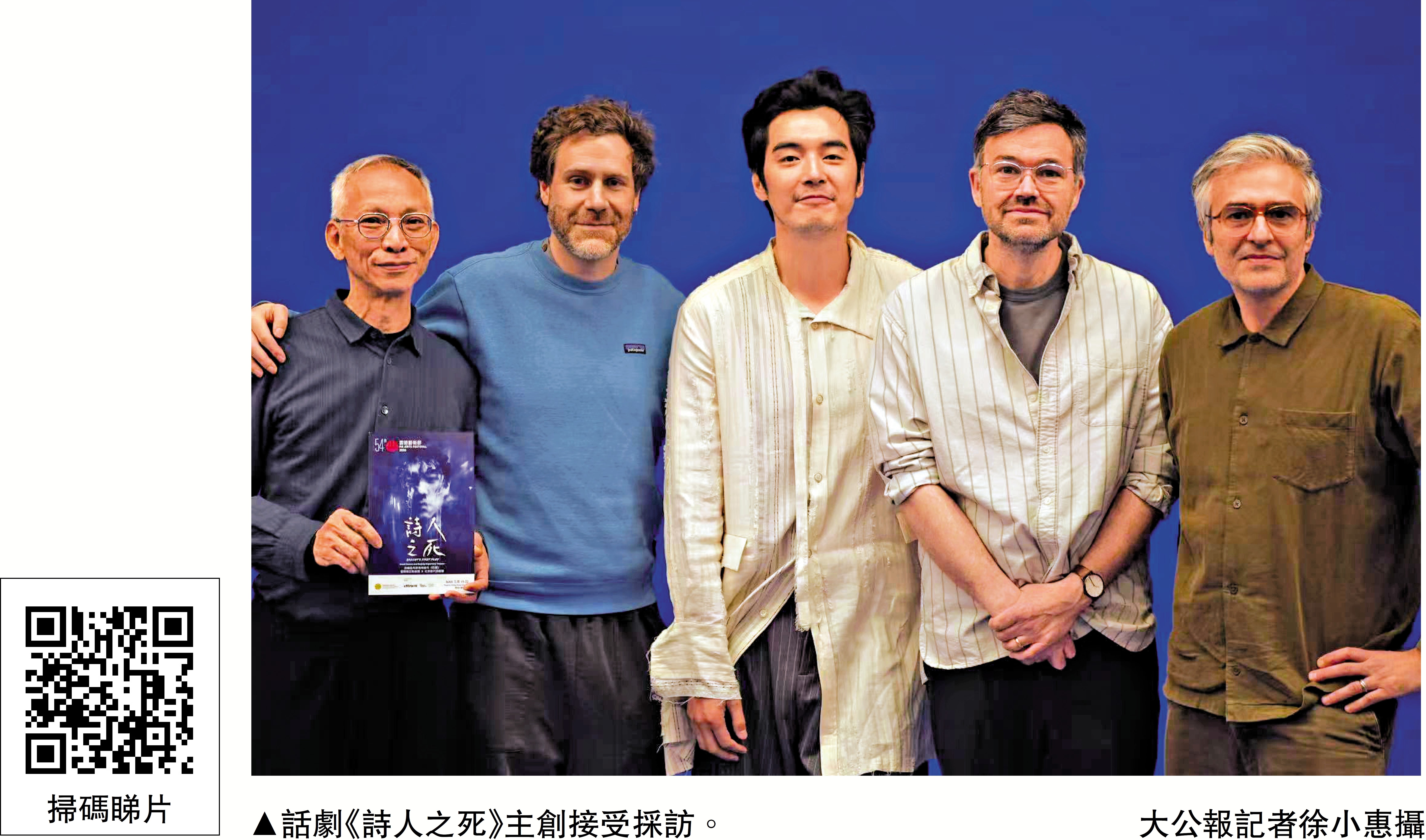由香港藝術節委約及與北京當代話劇團、抱風嶼及荷蘭藝術節聯合製作的話劇《詩人之死》將在今年3月於香港藝術節首演。這部話劇基於德國劇作家布萊希特的第一部戲劇作品《巴爾》創作而成,該劇主演金世佳、導演及改編Ben Kidd和Bush Moukarzel、多媒體設計Sebastien Dupouey日前在北京接受香港媒體採訪。