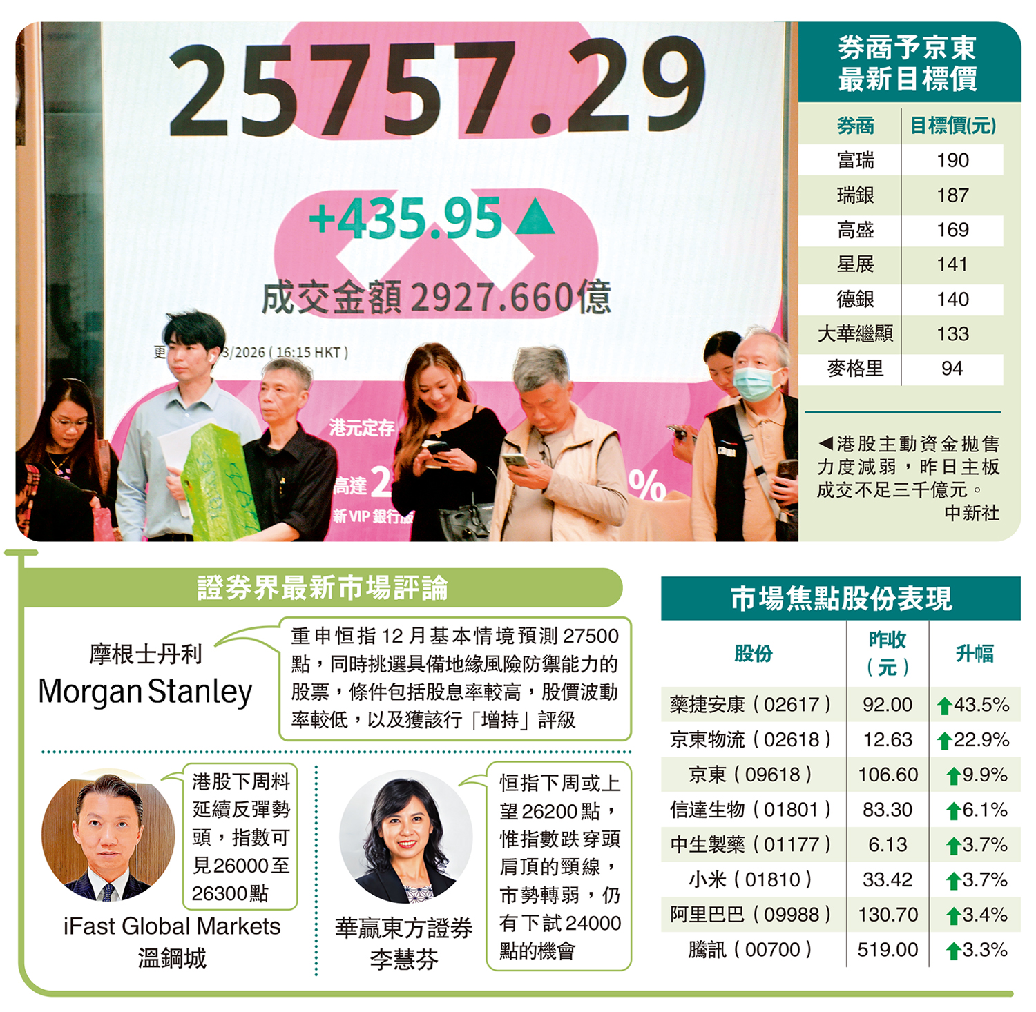 中東地緣衝突未有急劇惡化,淡友平倉止賺,亞太區市場向好,A股穩步上揚,利好恒指昨日高收435點。美國軟件股連日反彈,港股科網股跟升,恒生科指勁漲3.15%,其中重磅股阿里巴巴(09988)、騰訊(00700)升幅皆超3%。京東系業績理想,京東物流(02618)股價升22.9%,是升幅最大藍籌股;京東(09618)股價升近一成。展望後市,證券界人士預期,港股下周將可延續反彈態勢,恒指有機會上試26300點。市場風高浪急,大摩挑選具有防禦能力的股票,包括工行(01398)等四大內銀股。\大公報記者 劉鑛豪