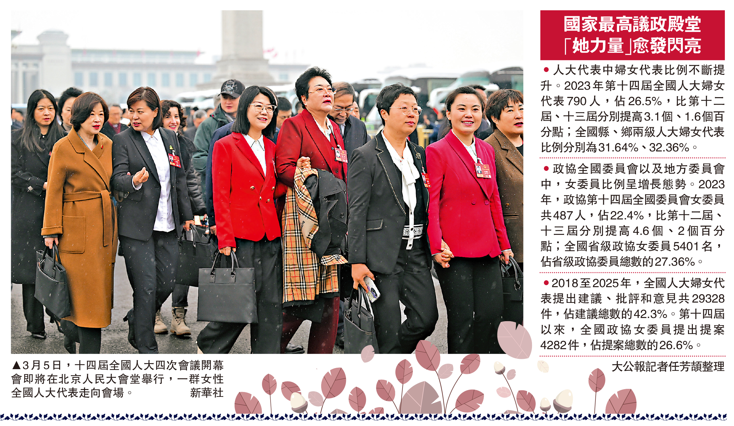從頂層設計到基層落地,從生育支持到就業保障,從健康守護到權益維護,廣大女代表、女委員帶着民情民意履職建言,把婦女發展、家庭幸福、社會公平寫進國家治理的生動實踐,為高質量發展注入溫暖而堅實的巾幗動能。不少男性代表委員也主動關注婦女兒童發展與性別平等議題,共同撐起守護婦女發展、家庭幸福的「半邊天」。\大公報記者 任芳頡北京報道