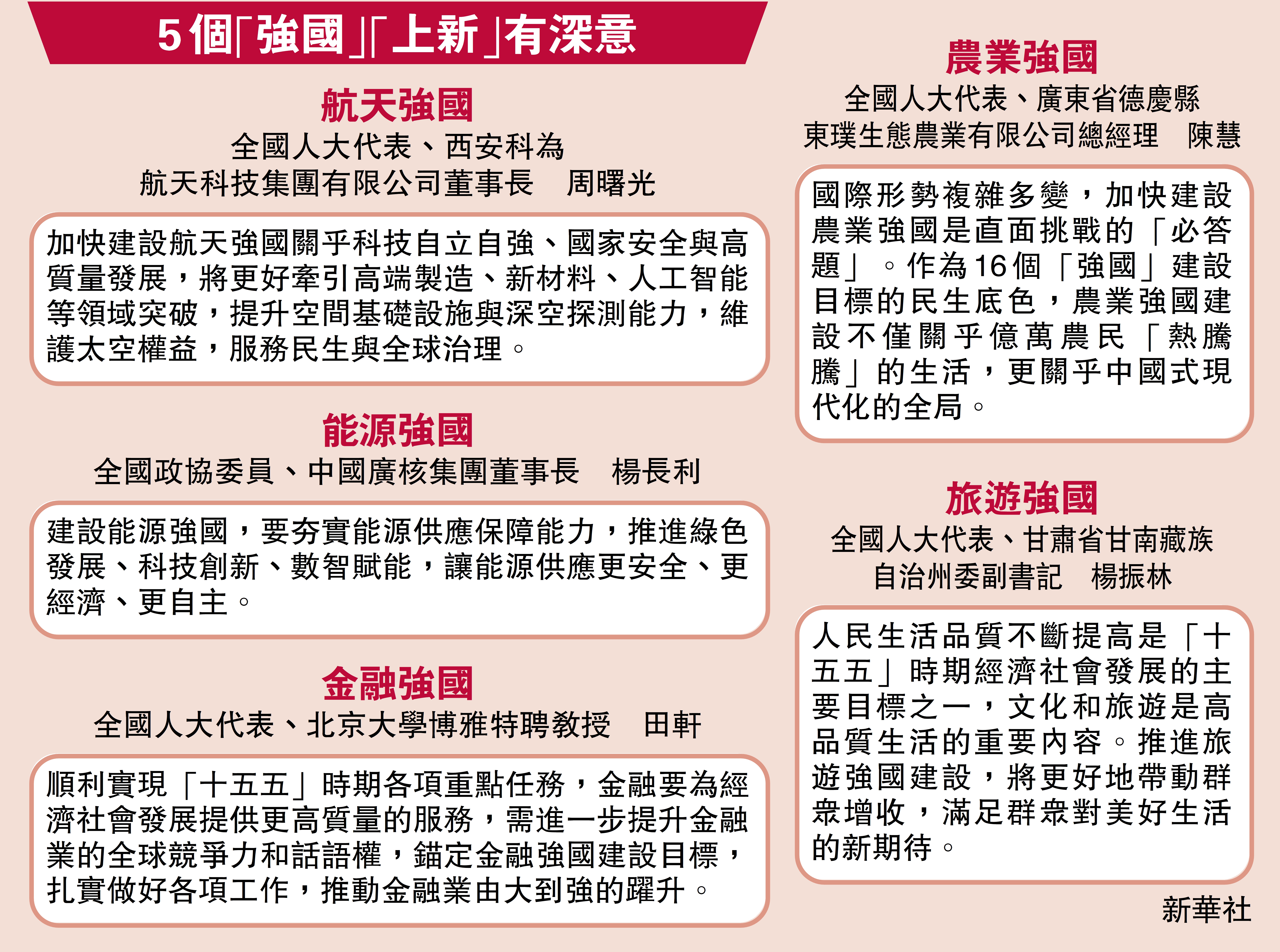【大公報訊】據新華社報道:5日,「十五五」規劃綱要草案提請十四屆全國人大四次會議審查。這份7萬餘字的「施工圖」中,製造強國、質量強國、航天強國等16個「強國」建設目標引人注目;與「十四五」規劃綱要相比,新增了5個「強國」建設目標(航天強國、能源強國、金融強國、農業強國、旅遊強國),勾勒出一幅社會主義現代化強國建設的最新圖景。