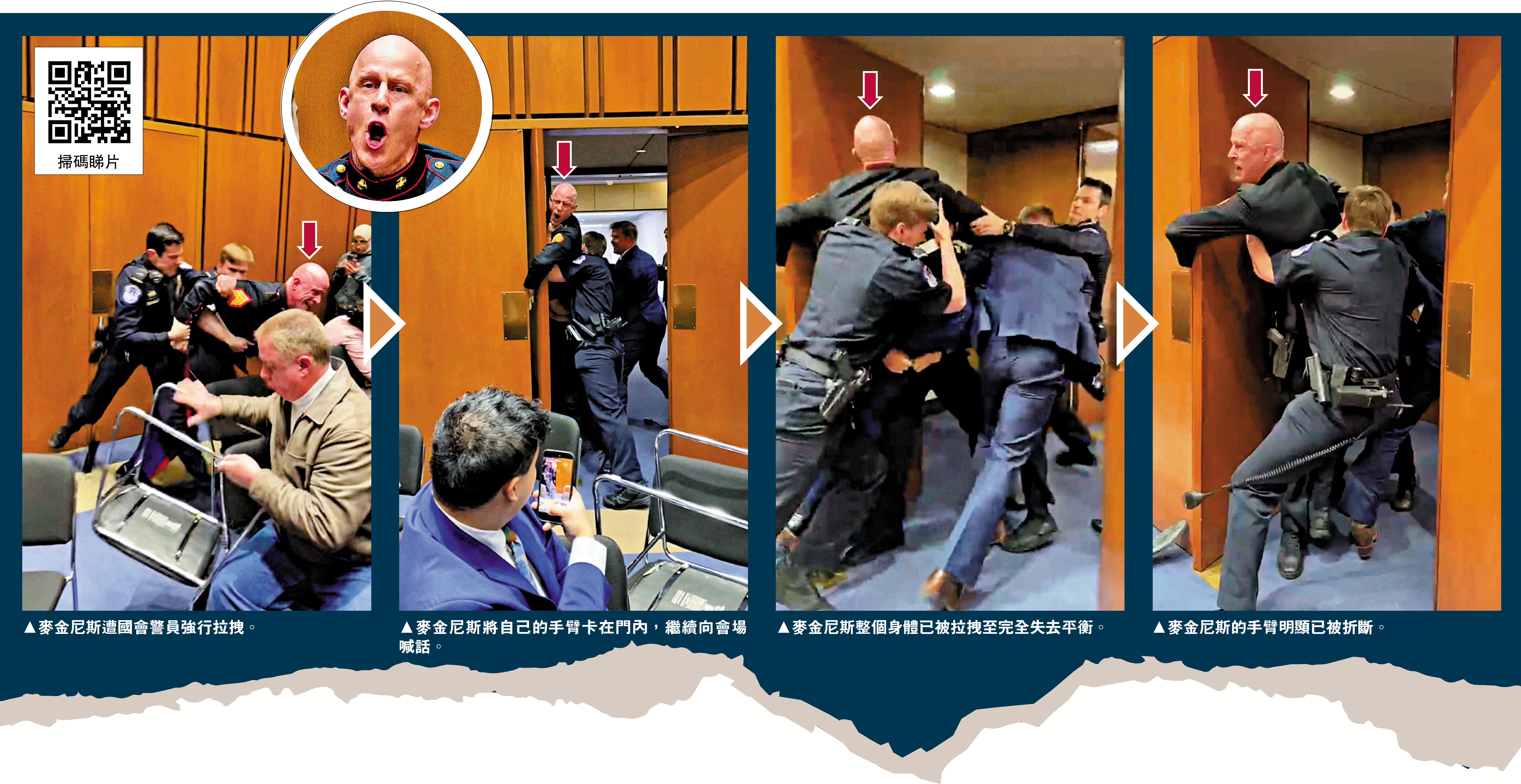 自2月28日美國和以色列對伊朗實施軍事打擊以來,已造成伊朗逾1300人死亡。美以暴行在全球掀起抗議浪潮,美國國內反戰聲音同樣高漲。3月4日,前美軍海軍陸戰隊員麥金尼斯在美國國會一場聽證會上,抗議美以在中東發動戰爭,高喊「沒有人願意為以色列而戰!」他隨後被多名警員和一名議員強行拖出會議室,在拉扯過程中,麥金尼斯的一隻胳膊被強行扯斷。\大公報記者 陳明