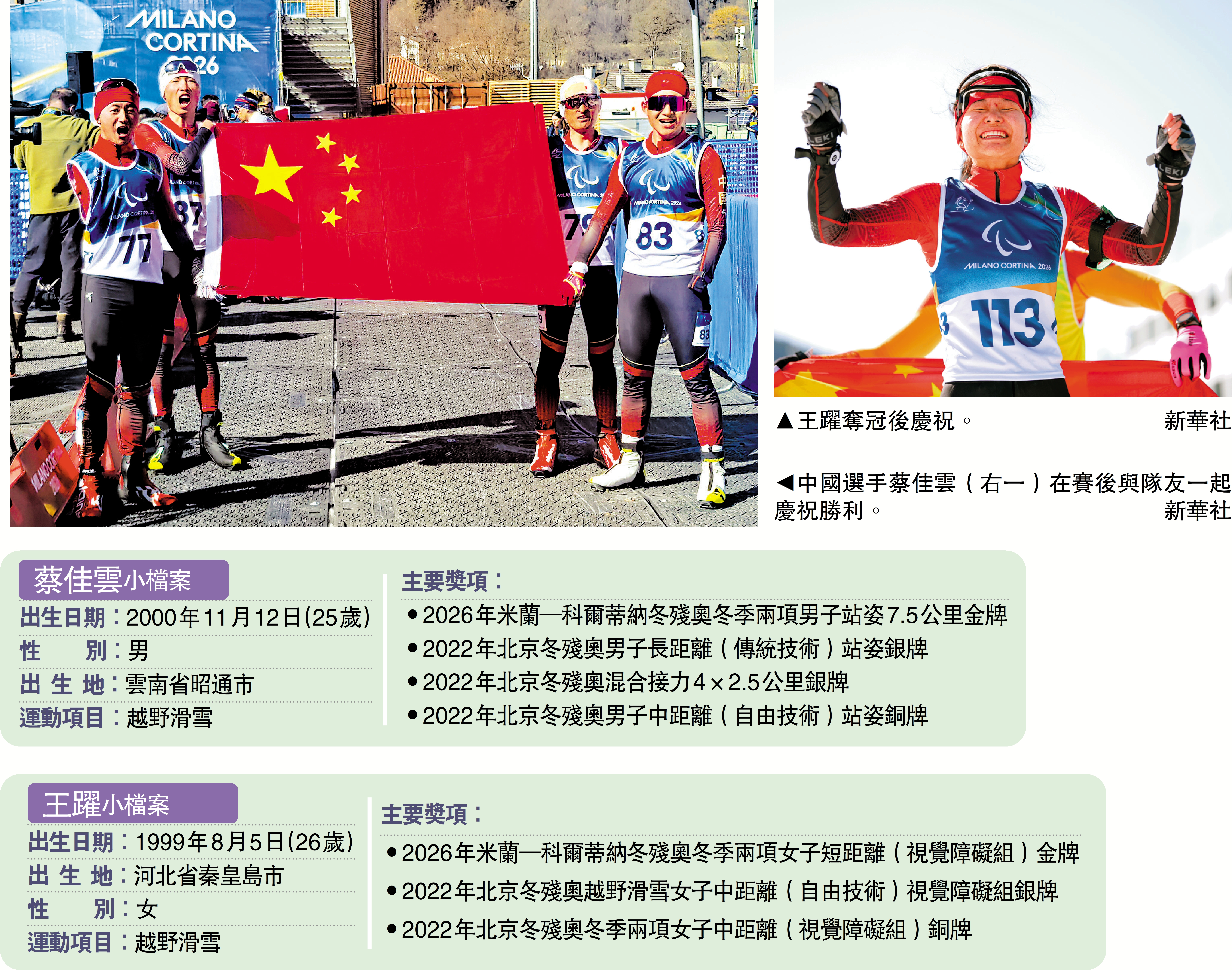 【大公報訊】記者譚德龍報道:國家隊在7日的米蘭─科爾蒂納冬季殘疾人奧運會取得今屆首枚金牌,蔡佳雲在冬季兩項男子站姿7.5公里賽事勇奪冠軍,而隊友劉曉彬則獲得銀牌,即國家隊在這個項目包辦了金、銀牌;而王躍在冬季兩項女子短距離視覺障礙組亦為國家隊增添一枚金牌。截至7日晚10時,國家隊已累積2金2銀2銅,超越了2018年韓國平昌冬殘奧取得1金的境外冬殘奧最佳成績。