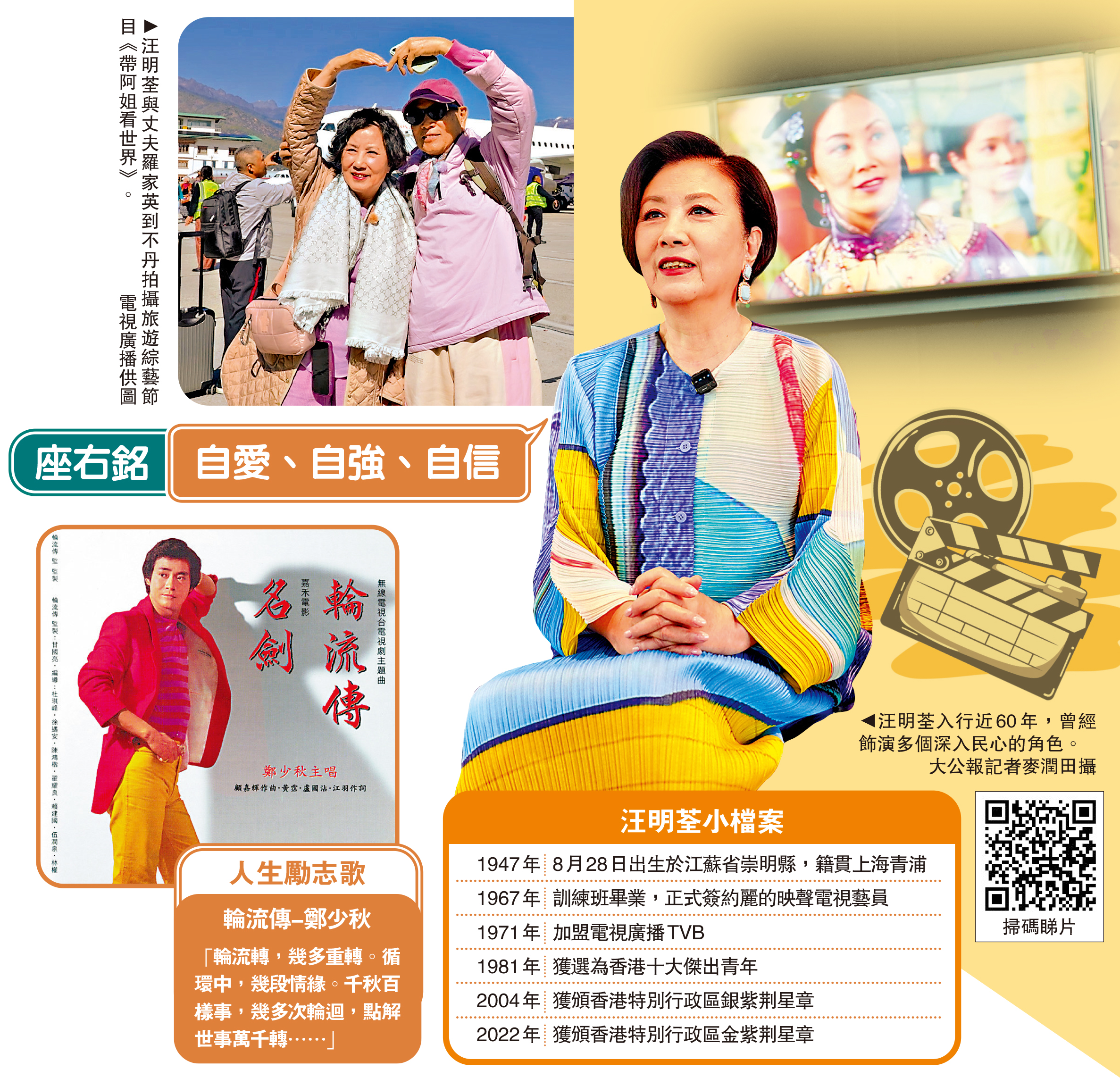 在3月婦女節期間,《大公報》特意邀請三位城中知名女性,分享人生經驗及成功的心路歷程。其中,在演藝界近60年、人稱「汪阿姐」的汪明荃,多年來「荃」心投入事業,由電視劇的女主角,到涉足歌唱生涯,一曲《熱咖啡》載歌載舞,後來還有參與綜藝節目、粵劇表演等,將人生打造成一套長篇連續劇,一切只是講求三大原則:自愛、自強、自信。\大公報記者 李潔儀