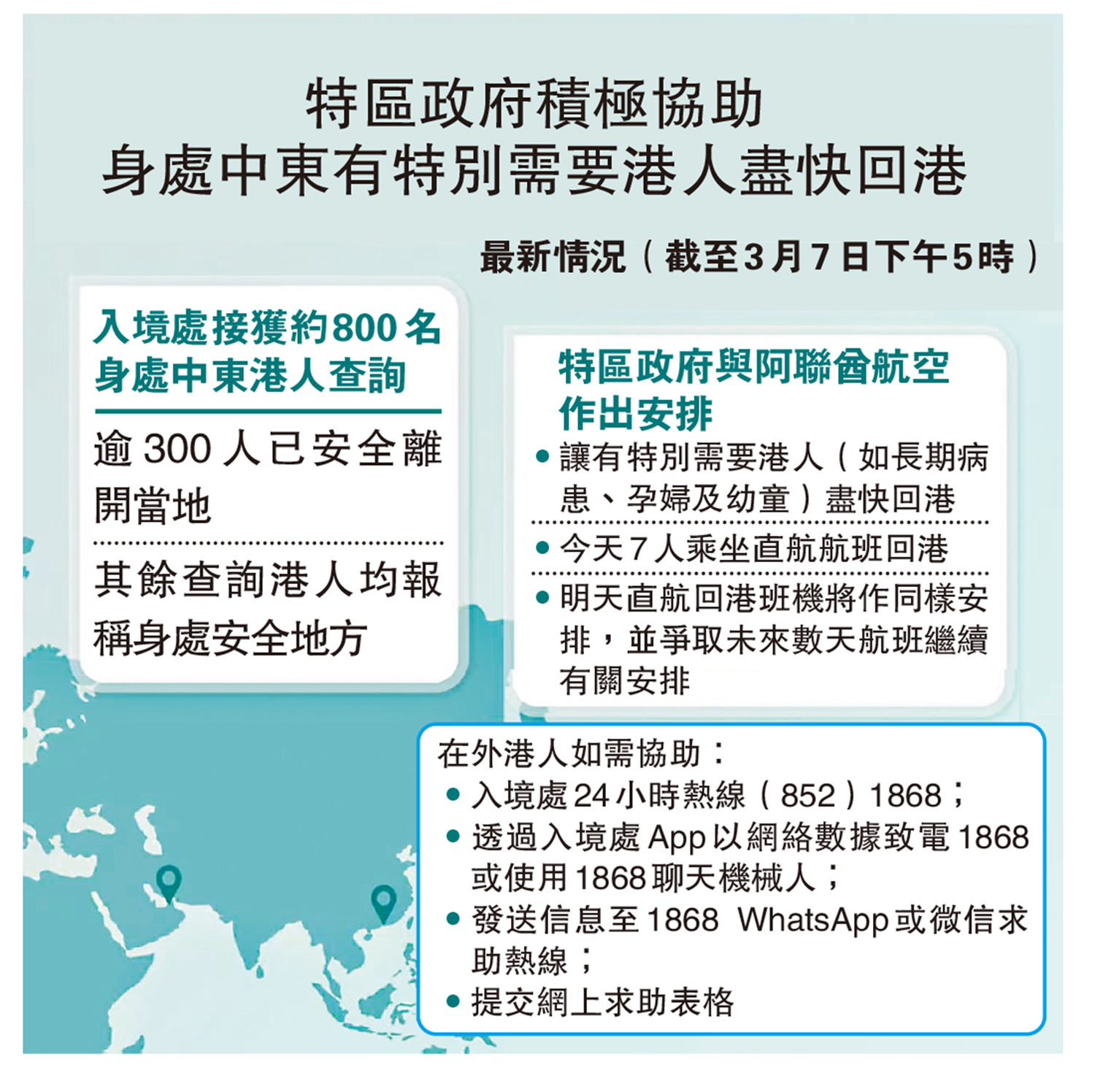 【大公報訊】記者黃佩琳報道:中東局勢持續緊張,特區政府發言人昨晚回覆《大公報》查詢表示,截至昨日下午5時,入境事務處共接獲約800名身在中東地區的港人查詢,當中超過300人已安全離開當地。特區政府已與阿聯酋航空作出安排,讓有特別需要的港人,如長期病患、孕婦及幼童盡快回港,經特區政府駐迪拜經貿辦人員協助理順後,7名有特別需要的港人昨天乘坐阿聯酋航空的直航航班回港,今天直航回港班機將作同樣安排,亦會爭取在未來數天的航班繼續有關安排。