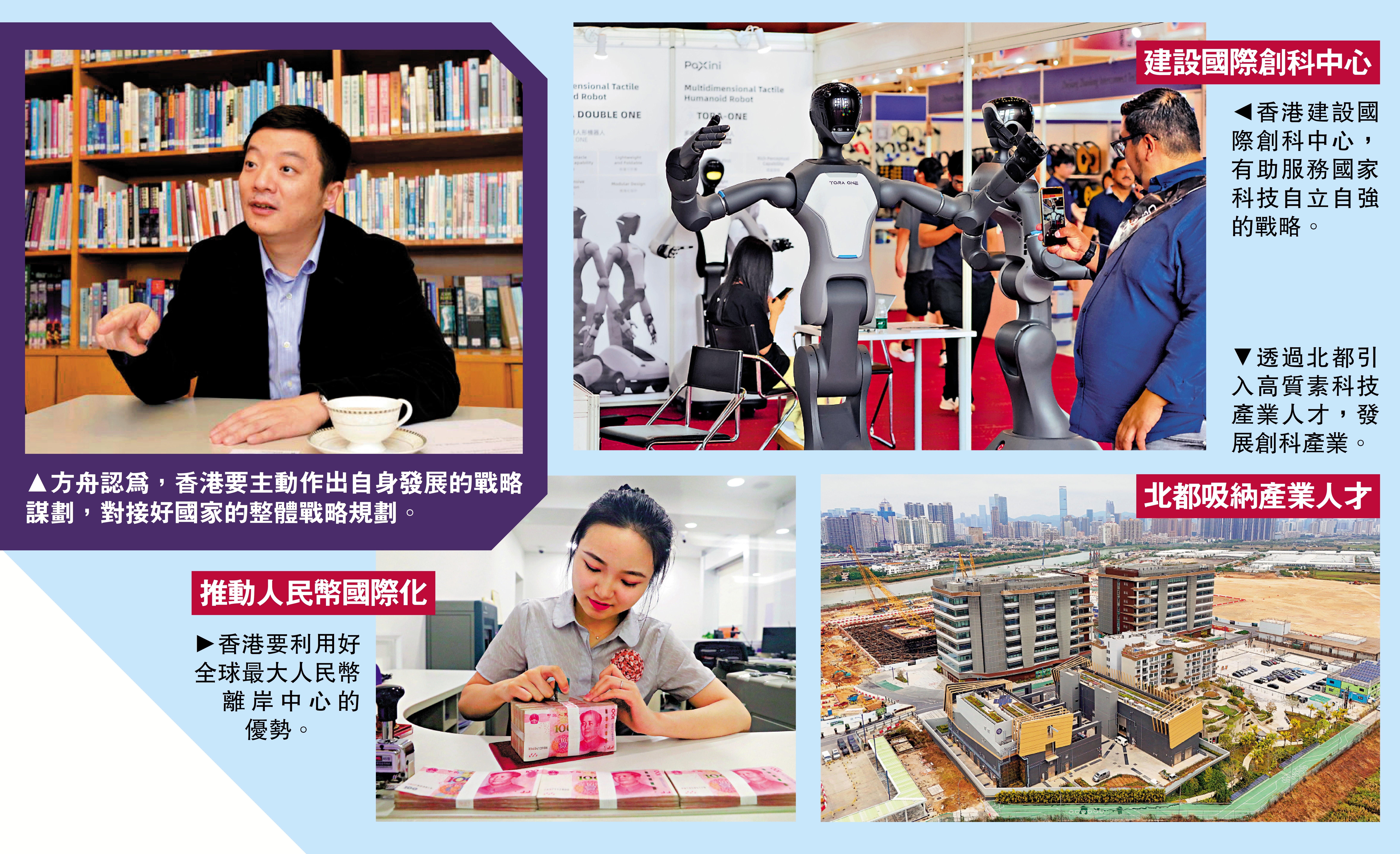 方舟強調,國家現在特別寄予厚望的是香港國際創科中心建設,期望其能服務科技自立自強的戰略。而國際創科中心的建設也需要與「國際高端人才集聚高地」建設相結合,通過吸引高質素的科技產業人才。過去香港通過八間研究型大學僅能吸納少量學術人才,以創科企業作為載體吸引產業人才的能力不足。未來應該把握北部都會區建設的機遇,通過「築巢引鳳」,從內地和海外吸引產業企業集聚,以企業為平台吸引高端人才,建設具有產業影響力的國際創科中心。