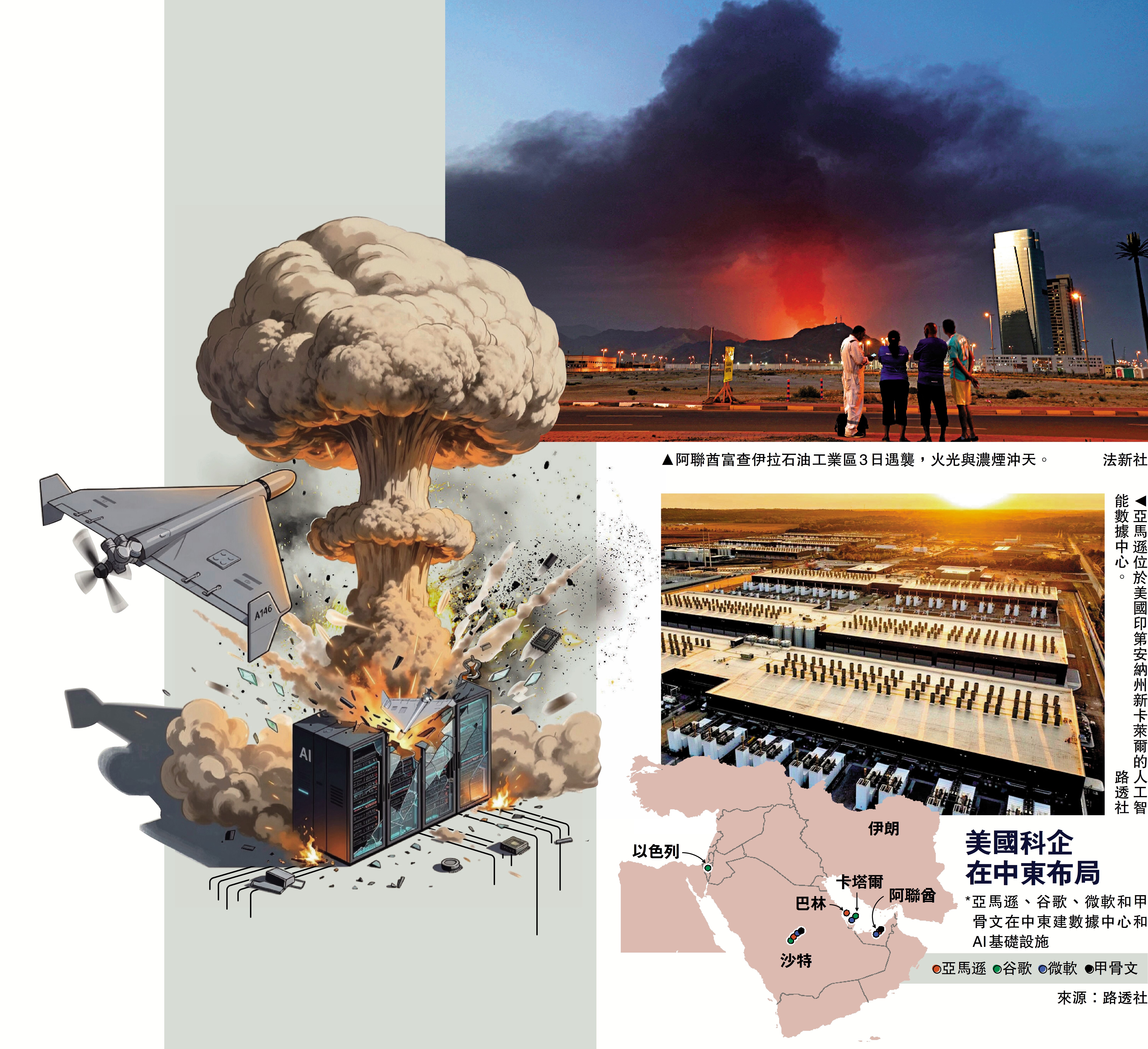 美國、以色列對伊朗軍事行動後,伊朗反擊波及中東鄰國,人工智能(AI)基礎設施第一次成為戰場中的目標。美國電商巨頭亞馬遜2日發布公告,公司位於巴林及阿聯酋的設施及數據中心,遭到多次空襲並且造成網絡中斷。分析指出,這次襲擊可能對阿聯酋和沙特產生連鎖效應,影響他們在未來數年建設本地AI基礎設施的計劃。\大公報記者 郭嘉