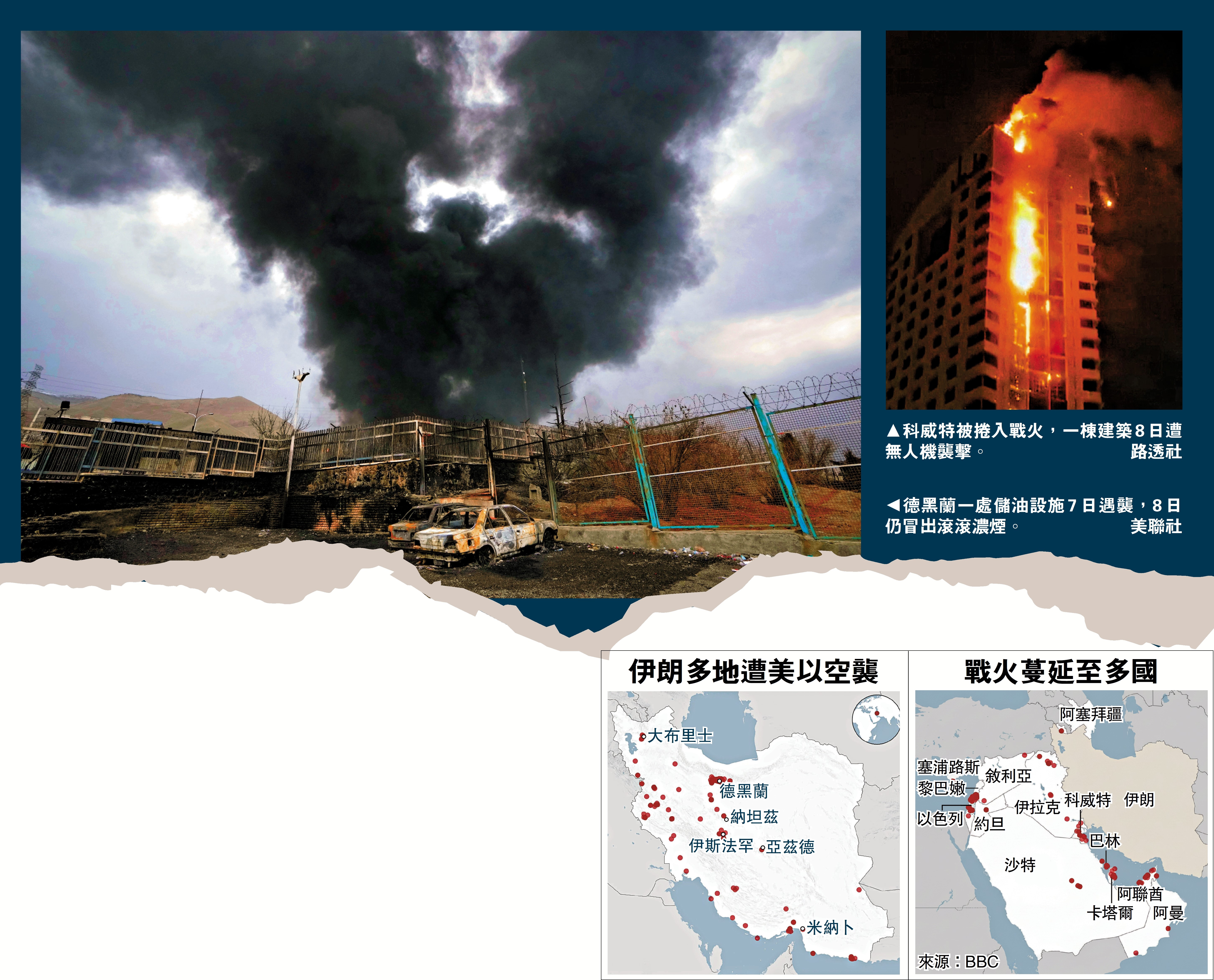美國和以色列8日繼續對伊朗發動軍事打擊,伊朗宣布對以色列和美國位於中東的軍事基地發起新一波反擊。美媒爆料稱,美以考慮派遣特種部隊進入伊朗,奪取高純度濃縮鈾。伊朗總統佩澤希齊揚8日強調,伊朗不會屈服,絕不允許敵人侵佔哪怕一寸土地。伊朗媒體披露,伊朗專家會議已就已故最高領袖哈梅內伊繼任者人選作出最終決定。以軍威脅稱,將「追殺」哈梅內伊繼任者。\大公報記者 郭嘉