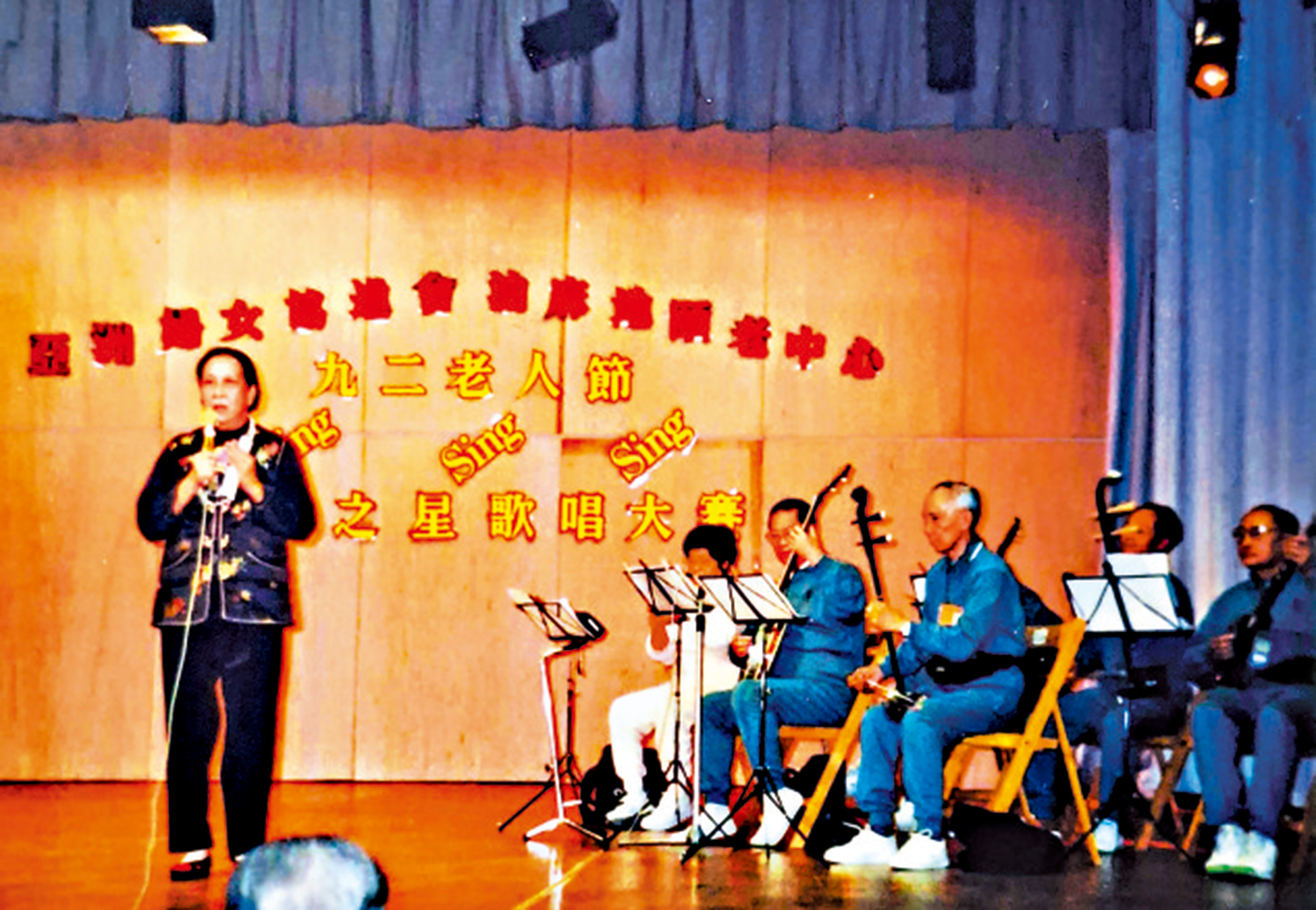 隨着子女成長,母親在上世紀八十年代中旬開始二次人生,於油麻地頤老中心的亞洲婦女協進會,除以「李師傅」身份參與教授八段錦、擔任交通安全隊隊長等活動,當然少不了粵劇等的排演。整理母親照片發現,她曾在台上與一隊現場伴奏的粵樂小組合演(附圖),那是上世紀九十年代卡拉OK盛行時期比較罕見的。
