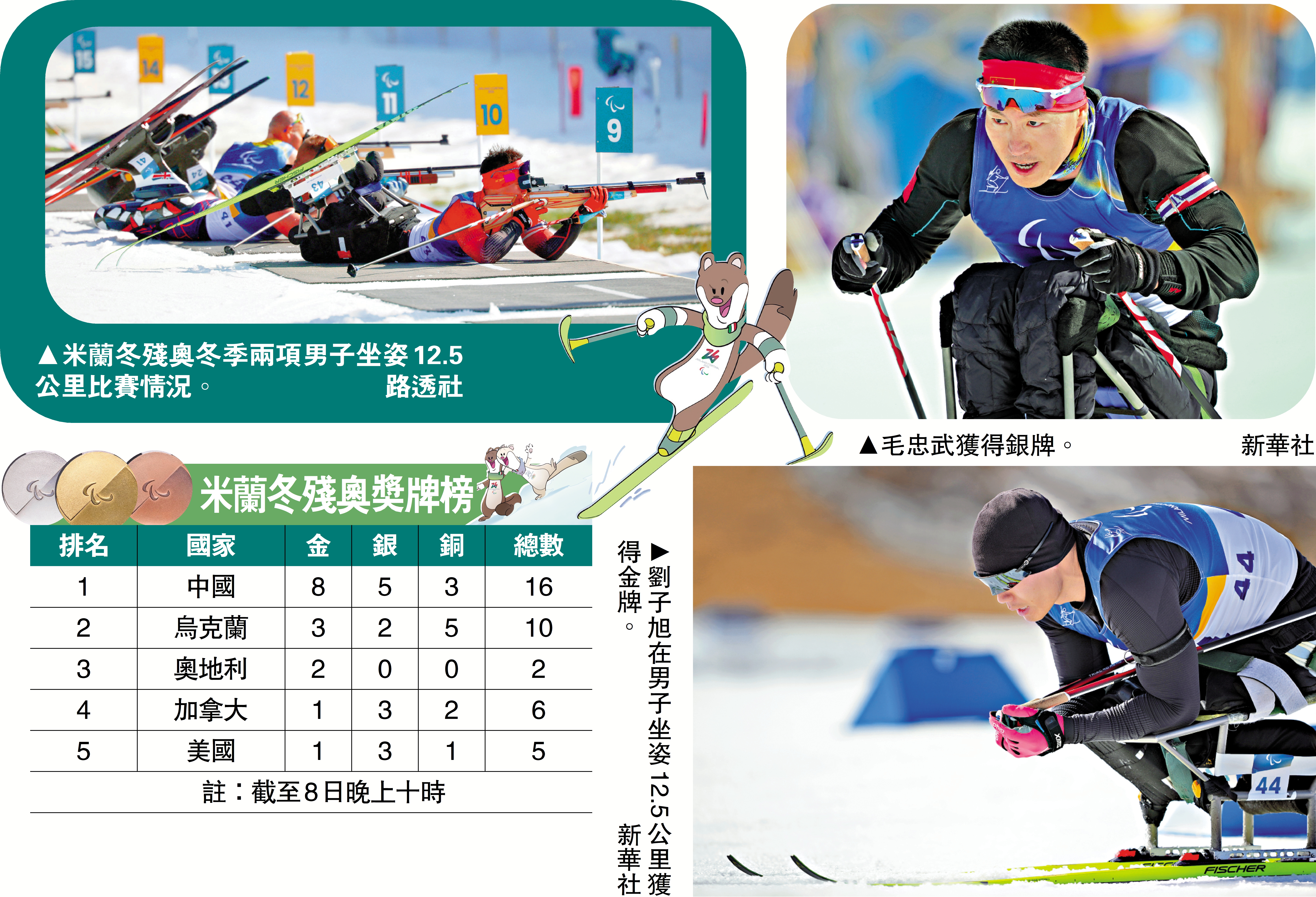 當地時間3月8日,米蘭—科爾蒂納冬殘奧會殘奧冬季兩項男子坐姿12.5公里比賽中,中國選手劉子旭、毛忠武分獲金銀牌。在前一天比賽日,劉子旭在殘奧冬季兩項男子7.5公里坐姿組比賽中獲得銅牌。截至8日晚上十時,國家隊在米蘭冬殘奧增添了六枚金牌,以8金5銀3銅居獎牌榜榜首。
