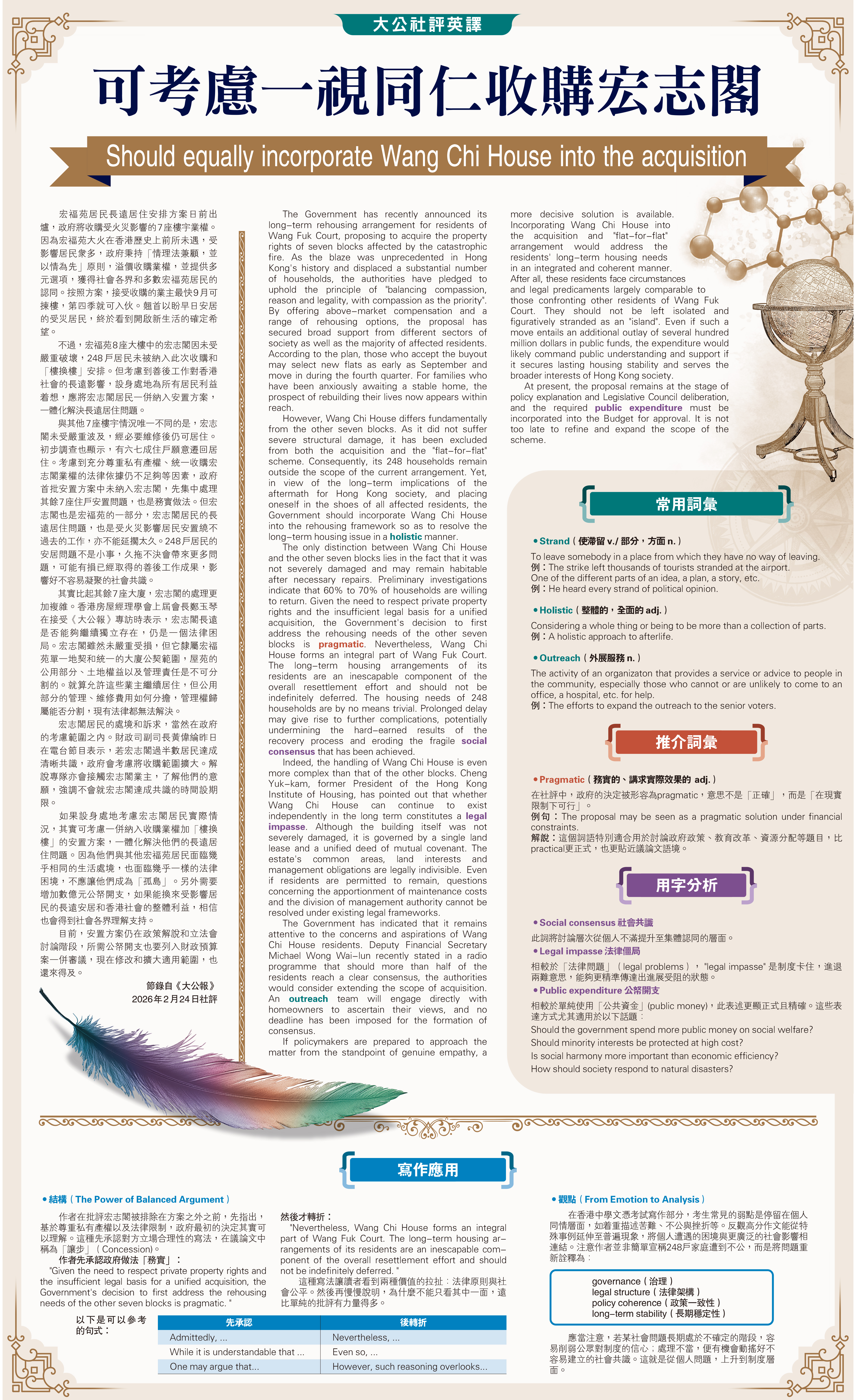 大公社評英譯/可考慮一視同仁收購宏志閣 Should equally incorporate Wang Chi House into the acquisition