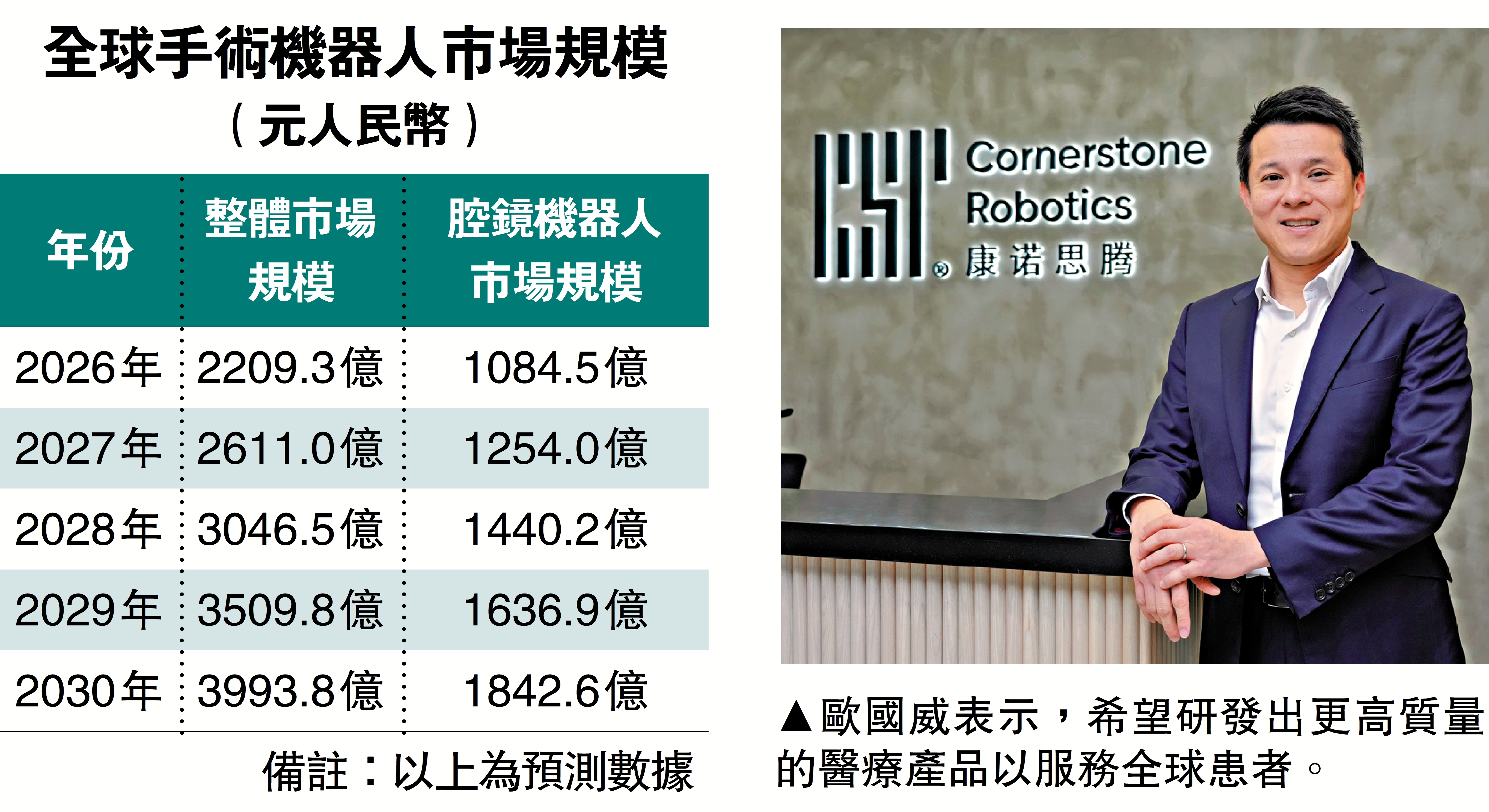 手術機器人為病人帶來更多治療選擇,受惠技術推動,市場正經歷前所未有的高速發展。歐國威表示,當前全球微創手術以腹腔鏡手術為主,每年約4500萬宗,其中約200萬宗有使用手術機器人,佔比約5%,其餘95%則依賴人手完成,市場發展空間廣闊。