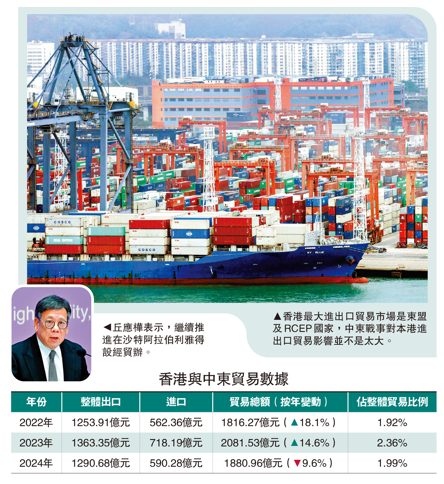中東局勢持續不穩,商務及經濟發展局局長丘應樺表示,戰事對本港進出口貿易較有影響,因應霍爾木茲海峽封鎖致貨物進出受阻,當局正研究其他方法應對。但他指出,香港的進出口市場廣泛,中東只是其中一個市場,加上香港正開拓更多位於中亞、東歐及北非等新興經濟體貿易合作關係,故整體影響不太大。同時當局繼續推進在沙特阿拉伯利雅得設經貿辦。\大公報記者 邵淑芬