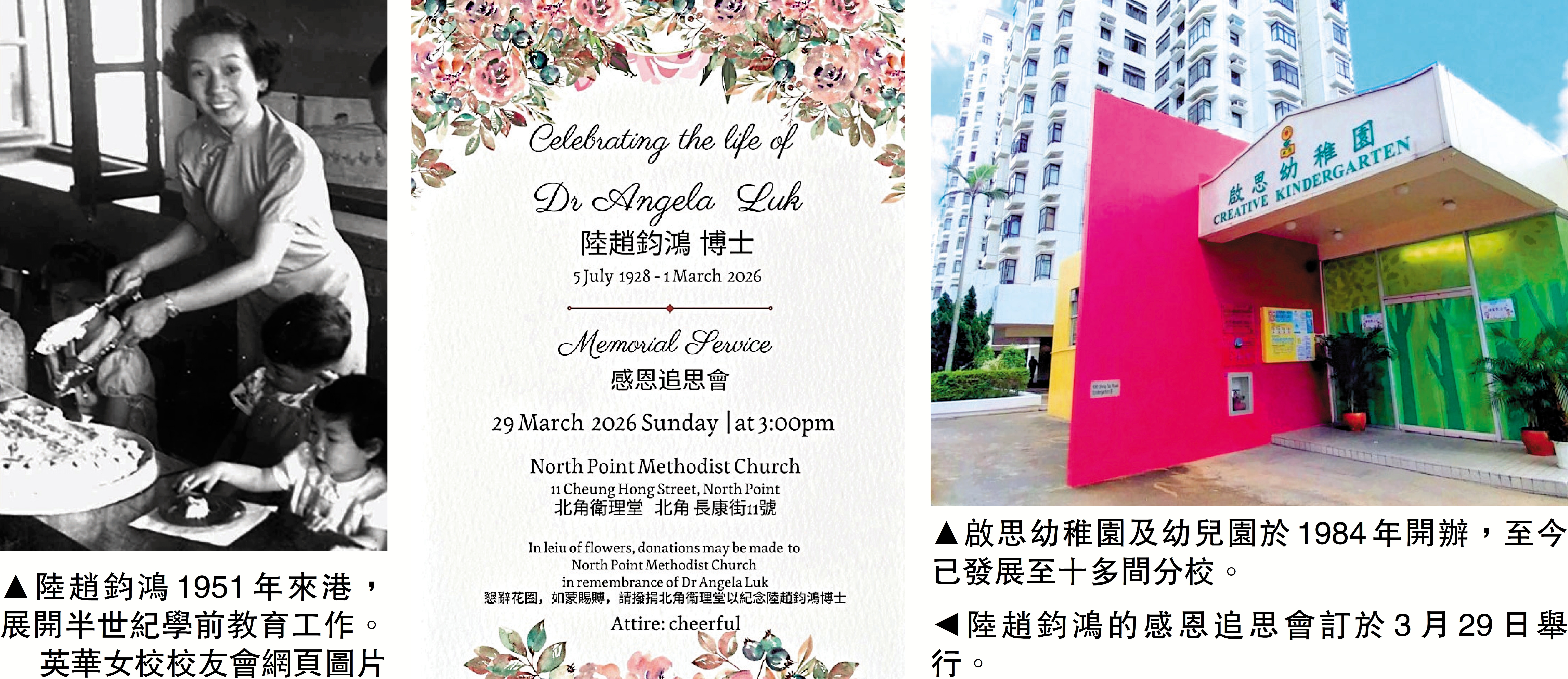 【大公報訊】香港教育家、名校啟思幼稚園創辦人陸趙鈞鴻於3月1日離世,享年98歲。啟思幼稚園昨日在學校網站張貼訃聞,讚揚她「畢生奉獻,以身踐道,為孩童築起知識與愛的園地」,對她離世深感哀痛,向其家人及朋友致以深切慰問。陸趙鈞鴻的追思會將於3月29日舉行。