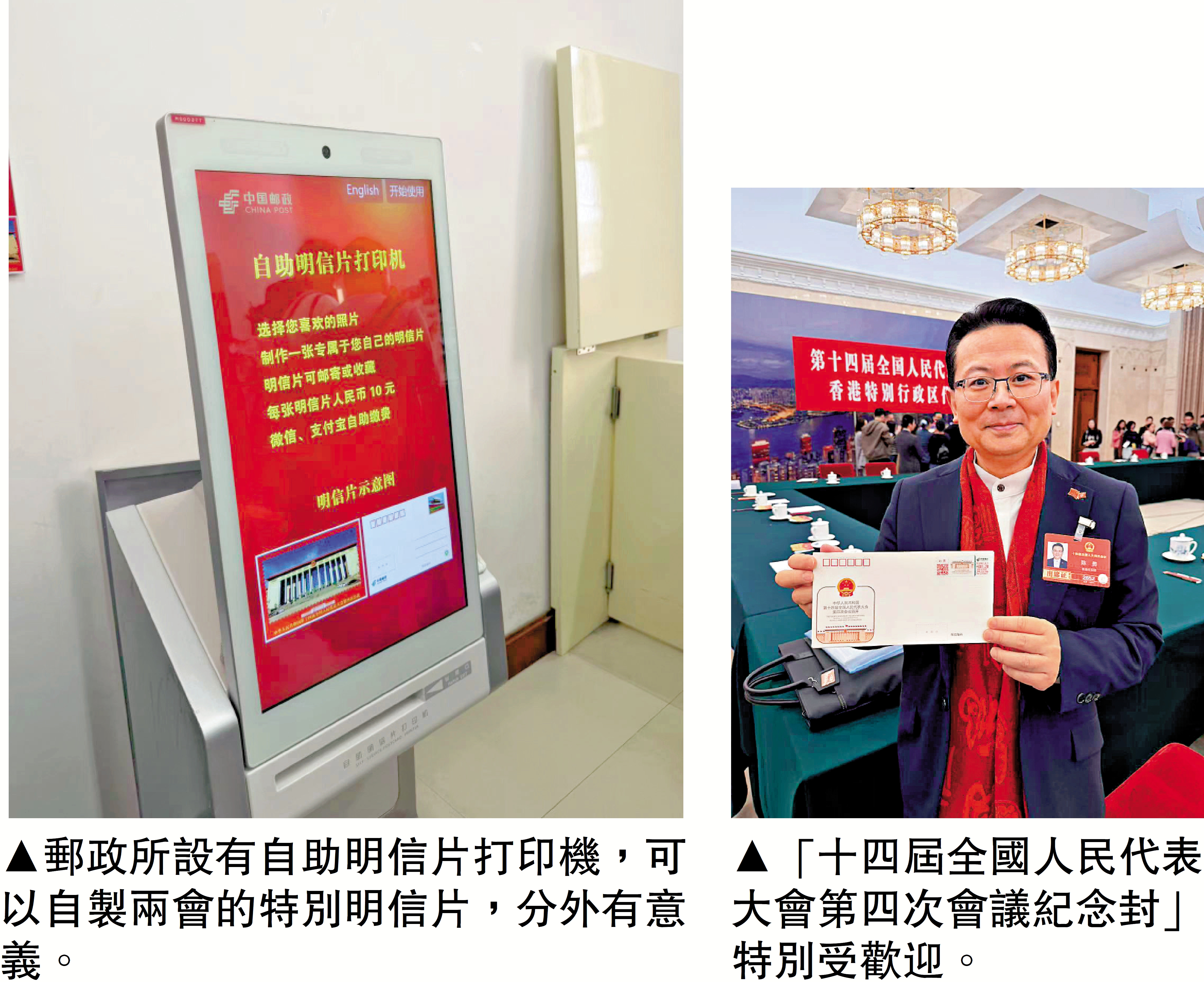 郵政所一角還設有自助明信片打印機,幾位記者同行正在排隊試用。他們將自己在人民大會堂拍攝的照片現場打印成明信片,製作一份獨一無二的兩會紀念,既別致,也饒有意義。\大公報記者 李慧妍(文、圖)