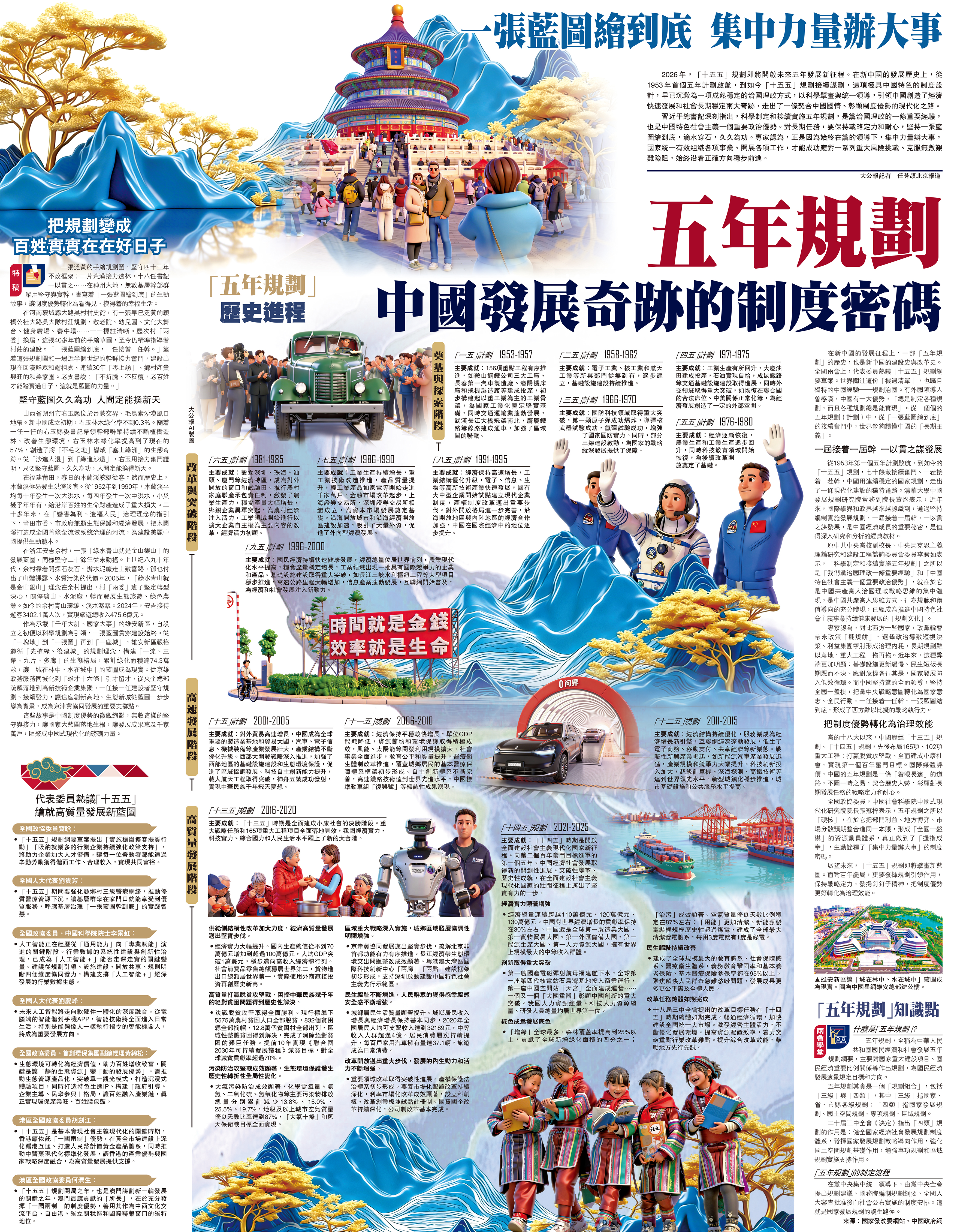 在新中國的發展征程上,一部「五年規劃」的歷史,也是新中國的建設史與改革史。全國兩會上,代表委員熱議「十五五」規劃綱要草案。世界關注這份「機遇清單」,也矚目獨特的中國經驗──規劃治國。有外國領導人曾感嘆,中國有一大優勢,「總是制定各種規劃,而且各種規劃總是能實現」。從一個個的五年規劃(計劃)中,從「一張藍圖繪到底」的接續奮鬥中,世界能夠讀懂中國的「長期主義」。