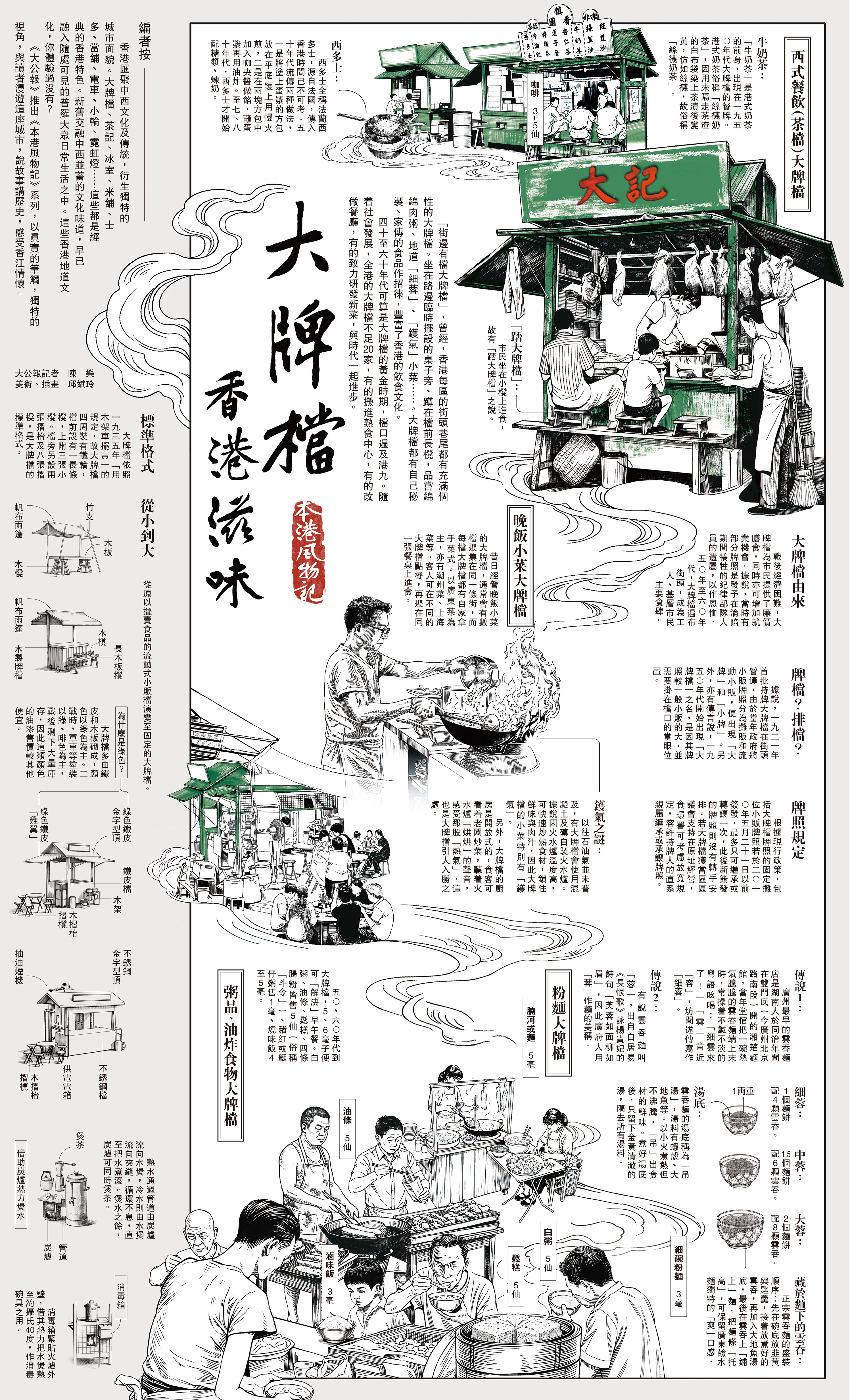 「街邊有檔大牌檔」,曾經,香港每區的街頭巷尾都有充滿個性的大牌檔。坐在路邊臨時擺設的桌子旁、蹲在檔前長櫈,品嘗綿綿肉粥、地道「細蓉」、「鑊氣」小菜……。大牌檔都有自己秘製、家傳的食品作招徠,豐富了香港的飲食文化。