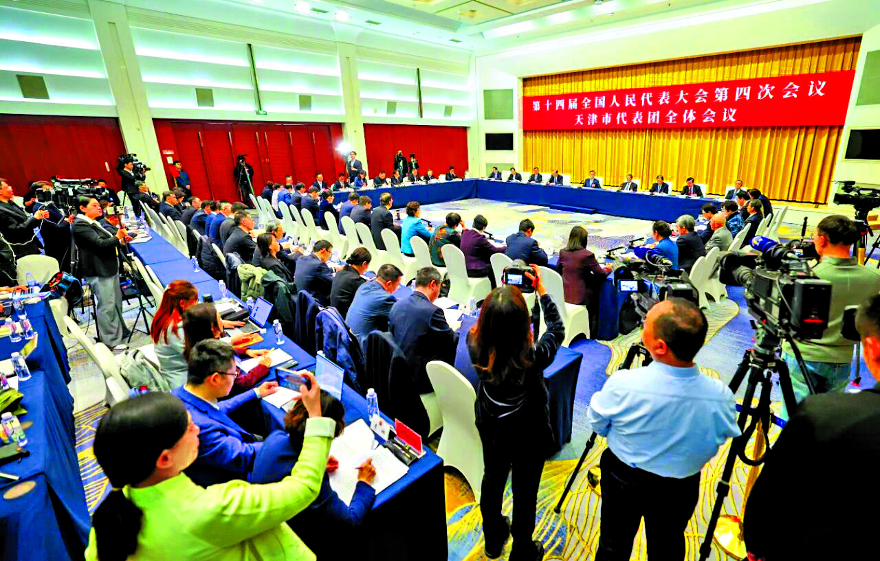 圖﹕十四屆全國人大四次會議天津代表團舉行開放團組會議。