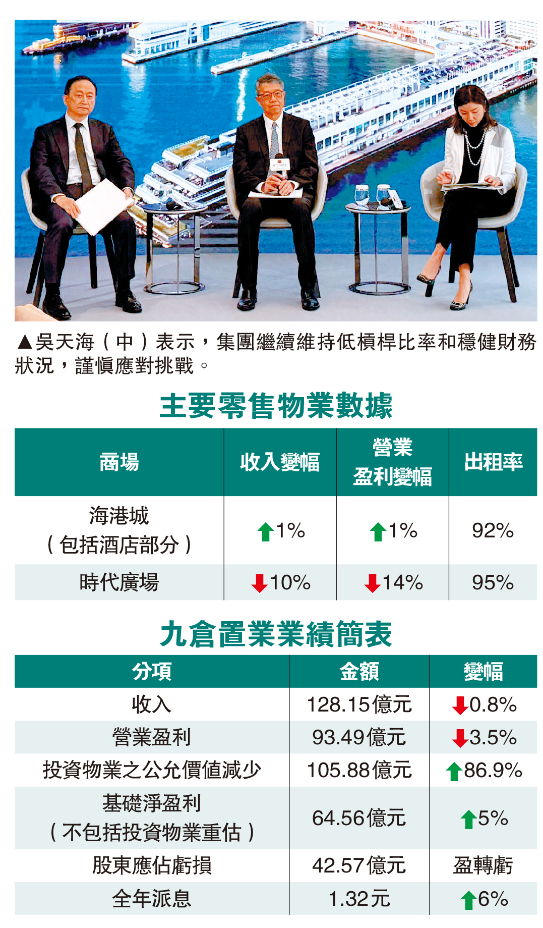 另九龍倉置業旗下海港城去年收入升1%至92.2億元,營業盈利亦升1%至72.4億元,分別佔集團收入72%及佔營業盈利77%,截至年底商場出租率92%。時代廣場去年收入則跌10%至15億元,營業盈利跌14%,商場出租率95%。