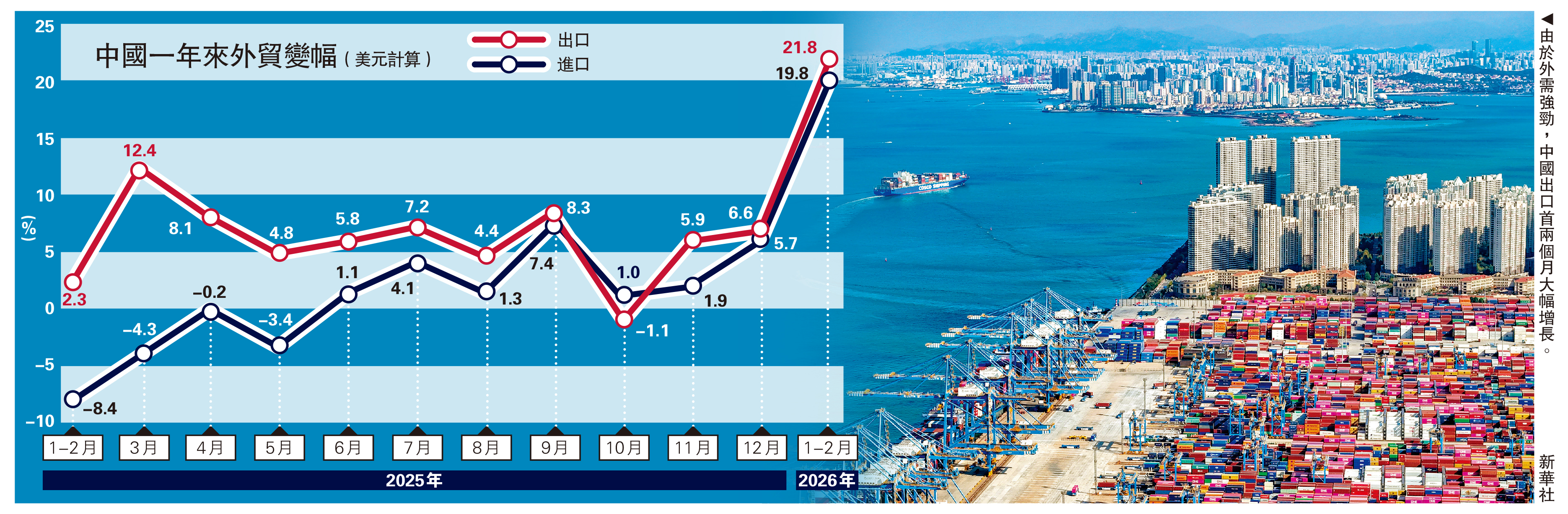 中國外貿實現「開門紅」。據國家海關總署數據顯示,今年首兩個月,中國貨物貿易進出口總值7.73萬億元(人民幣,下同),按年增長18.3%。其中出口增長19.2%,進口增長17.1%。若以美元計價,首兩個月進出口總值1.1萬億美元,按年升21%,其中,出口總值6565.8億元,增長21.8%,遠高於市場預期的7.1%。進口4429.6億元,增19.8%,亦遠勝預期的6.3%。
