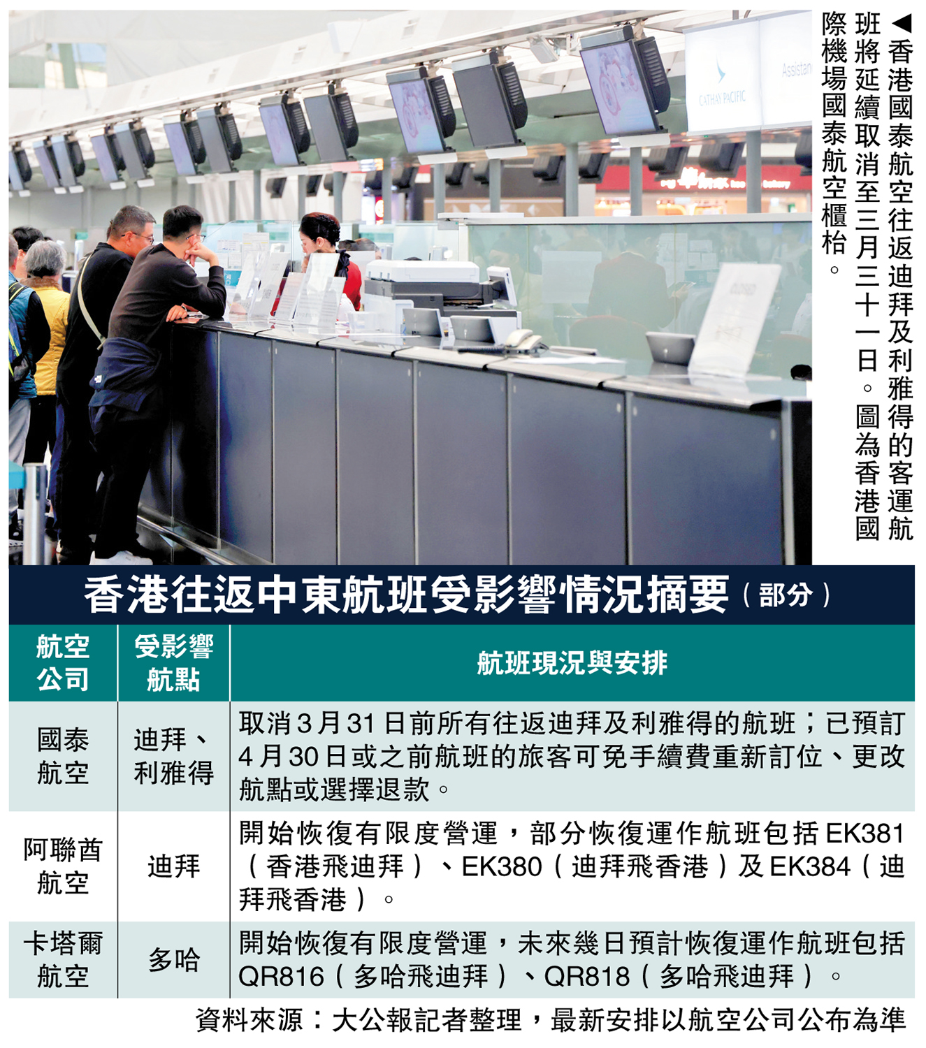 受中東地區戰事持續影響,多間航空運營商紛紛宣布,延長中東地區部分定期商業航班的停飛期。國泰航空昨日宣布,因應中東局勢動盪,國泰每日往返迪拜及利雅得的客運及貨機航班,將繼續取消至3月31日。受影響的旅客可以重新預訂機票、更改航點或退票。\大公報記者 鄭文迪
