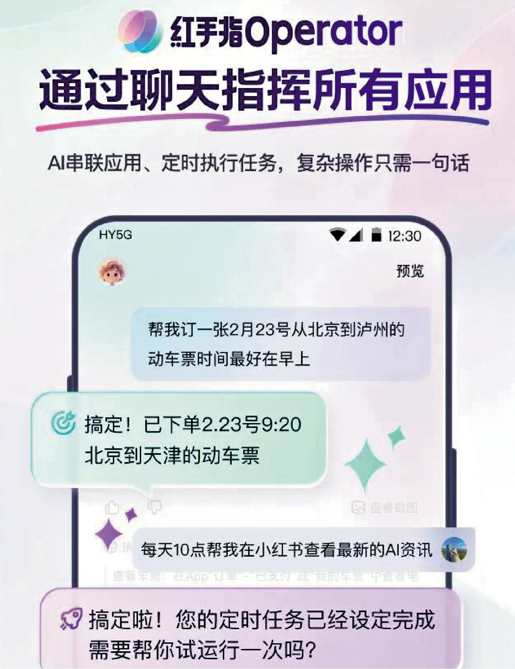 紅手指Operator是一款類OpenClaw的移動端智能體,能夠在手機上直接調用應用、執行任務。用戶下載安裝後,就可以通過聊天方式指揮手機裏的各類App完成操作,例如買票、打車、訂外賣、資料搜集或信息查詢等任務。