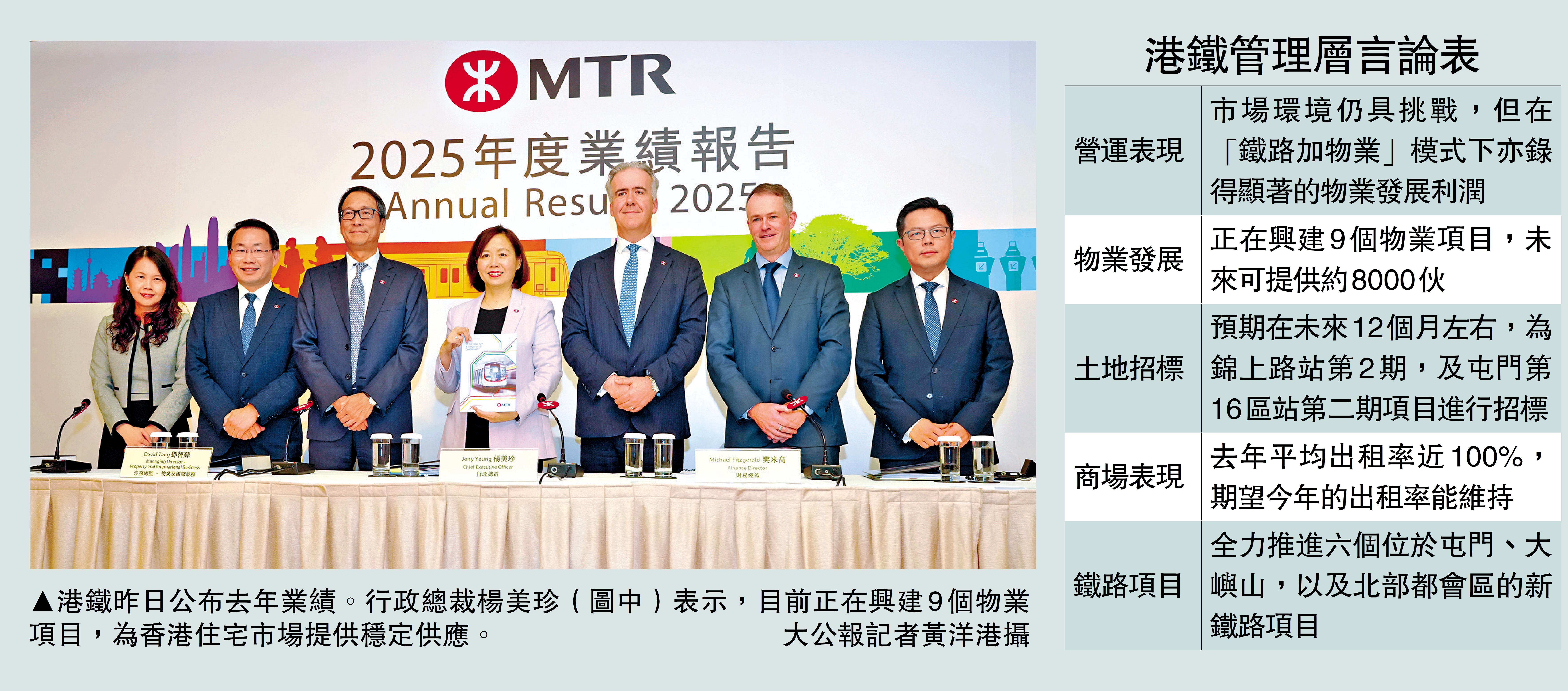 港鐵行政總裁楊美珍表示,物業收益是一次性的,而且會有波動,所以我們會審慎部署未來的現金需要,並做好工程及財務管理,靈活運用融資,以應對建造高峰期。目前港鐵正在興建9個物業項目,未來可提供約8000伙,去年亦批出屯門第十六區站第一期物業發展項目合約,為香港住宅市場提供持續供應。