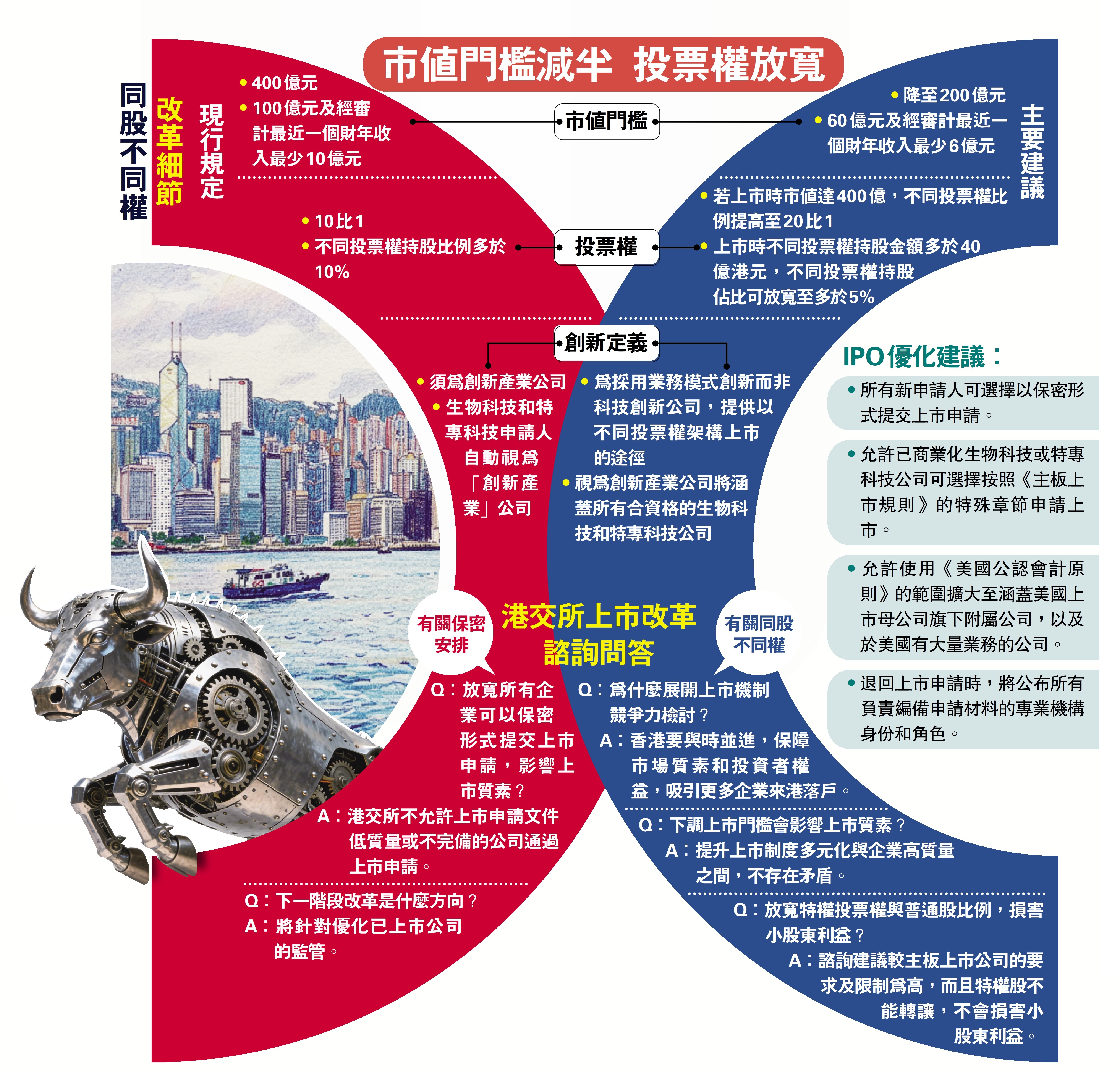 港交所展開的諮詢建議圍繞三個主題,包括不同投票權、來港第二上市、首次公開招股(IPO)規定及上市安排。其中,採用不同投票的公司基本市值門檻,由400億元降至200億元,而年收入10億元及市值100億元的門檻,亦分別降至6億元及60億元。