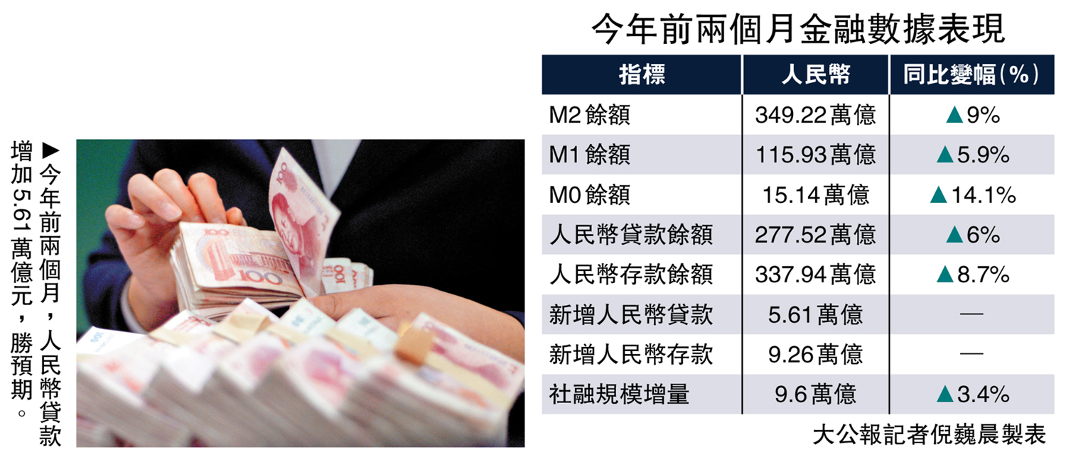 【大公報訊】記者倪巍晨上海報道:年初信貸投放節奏總體平穩,宏觀逆周期政策調節力度不減。中國人民銀行數據顯示,今年前兩個月,人民幣貸款增加5.61萬億元(人民幣,下同),略高於市場預期,社融規模增量累計9.6萬億元,較上年同期多3162億元或3.4%。《大公報》依據前值測算,2月人民幣貸款增加9000億元,社融規模增加2.38萬億元。分析稱,開年以來金融總量指標實現穩健增長,市場流動性保持較充裕水平,鑒於當前信貸、社融結構呈現的「企業強、居民弱、政府穩」的特徵,實體經濟需求修復節奏尚不均衡,結構仍待優化。