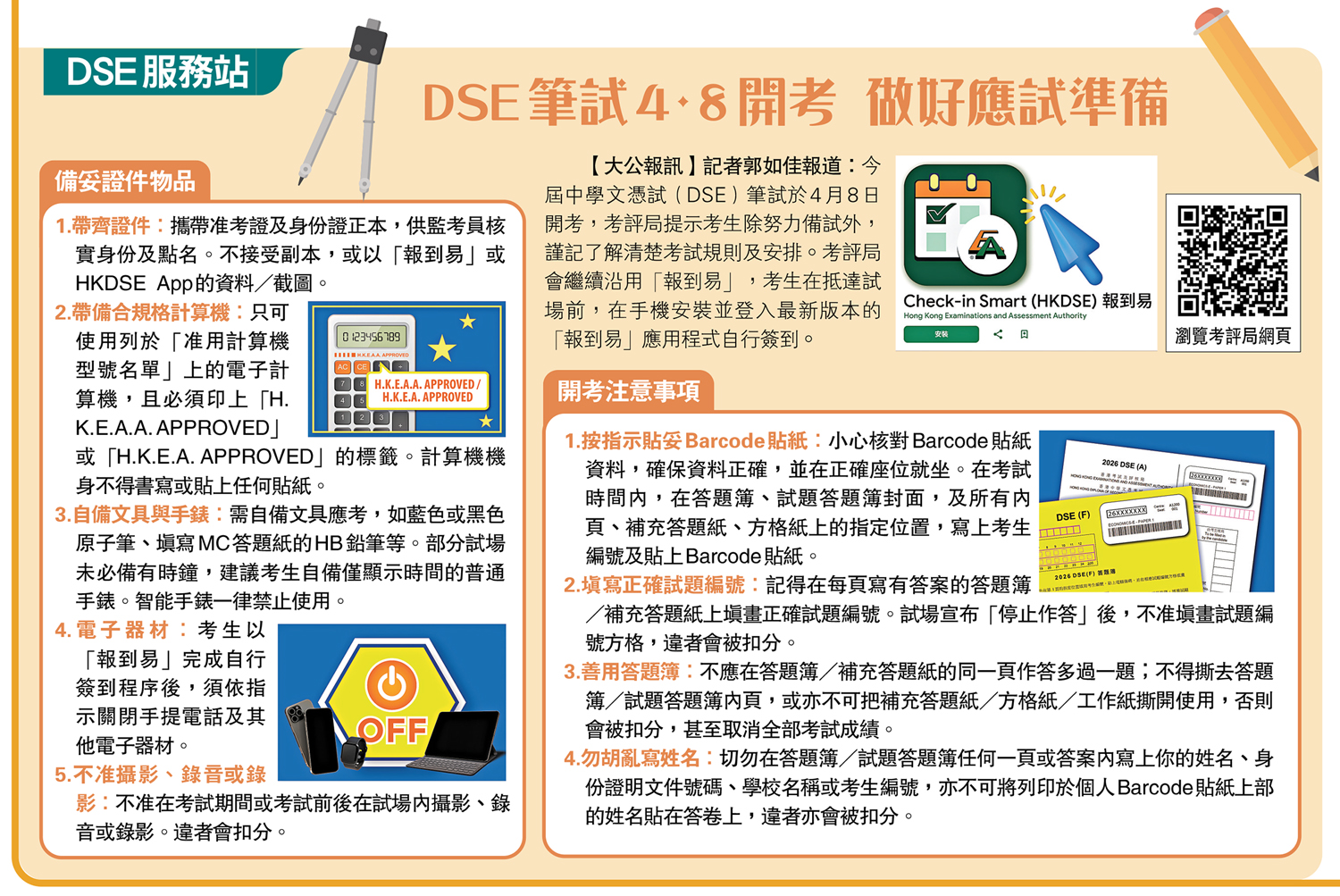 【大公報訊】記者郭如佳報道:今屆中學文憑試(DSE)筆試於4月8日開考,考評局提示考生除努力備試外,謹記了解清楚考試規則及安排。考評局會繼續沿用「報到易」,考生在抵達試場前,在手機安裝並登入最新版本的「報到易」應用程式自行簽到。