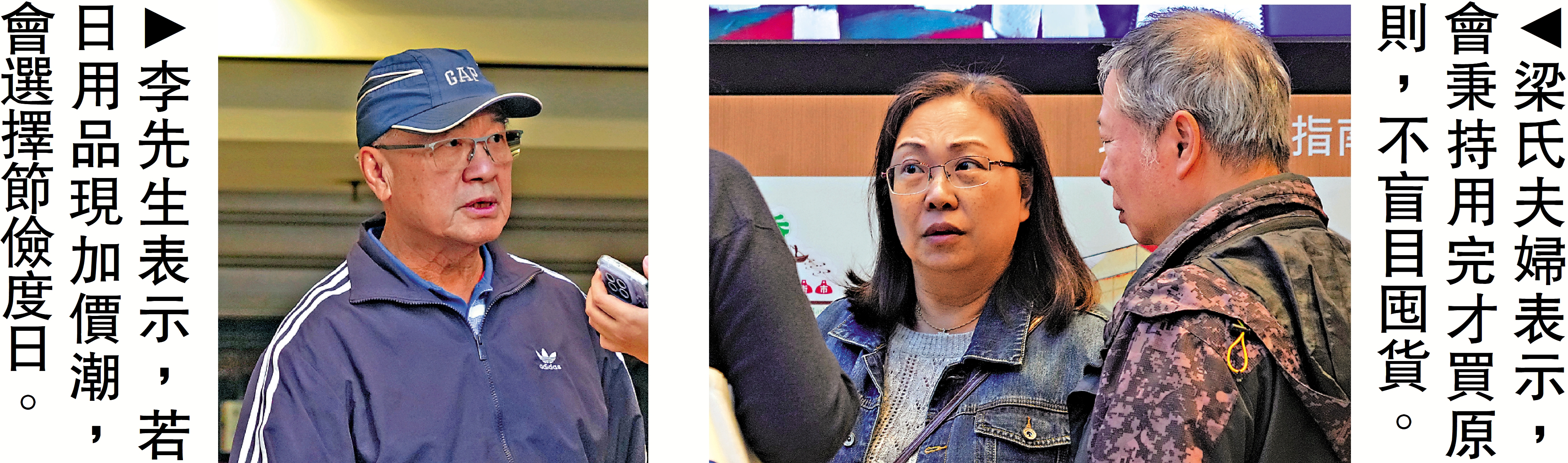 對於油價持續攀升,可能引發日用品加價。市民梁氏夫婦表示,會秉持理性消費態度,用多少買多少、用完即買的原則,不會盲目囤貨。談及中東戰爭,他們認為特朗普行事不負責任、不擇手段,全然不計後果。
