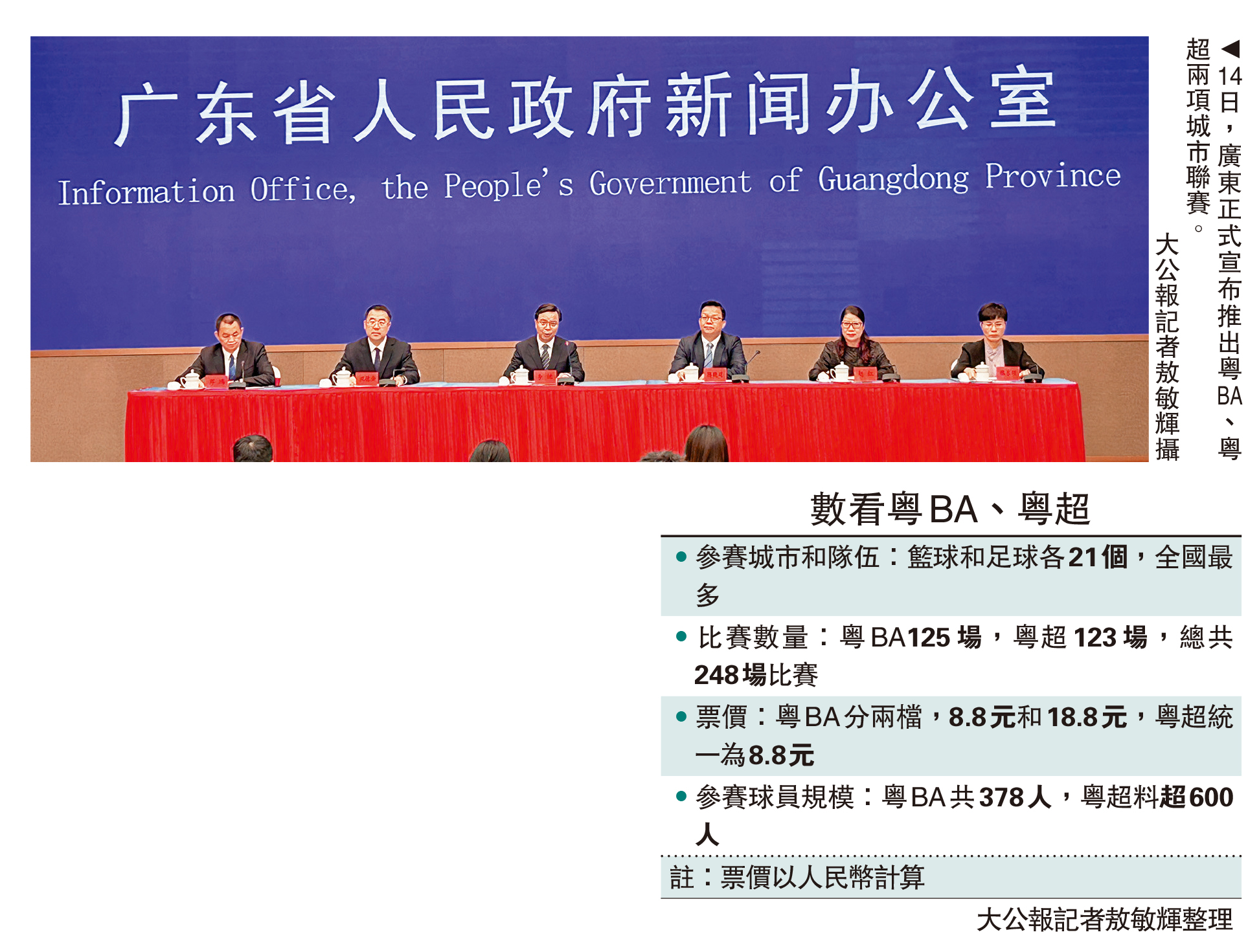 【大公報訊】記者敖敏輝廣州報道:廣東省政府新聞辦14日舉行發布會,正式官宣兩項重大體育賽事:廣東省城市籃球聯賽(「粵BA」)和廣東省城市足球超級聯賽(「粵超」)。粵BA和粵超雙賽「齊飛」,每個城市各組建一支球隊,首場比賽於3月21日打響,時間跨度達8個月。值得一提的是,作為擁有最多地級市(21個)的省份,廣東各城市全員參賽,以珠江為界劃分賽區,東區、西區分別11隊、10隊,這不僅創下廣東籃球、足球賽事史上覆蓋範圍最廣的紀錄,也將打造成全國規模最大的省級體育城市聯賽。
