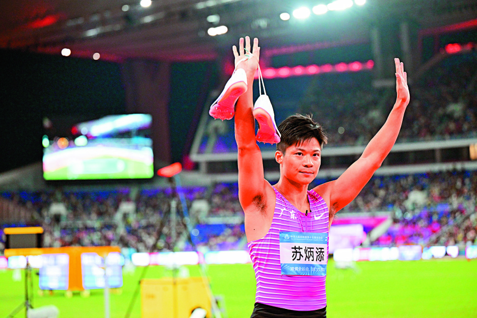 蘇炳添在2025年11月的全運會比賽後向觀眾致意。