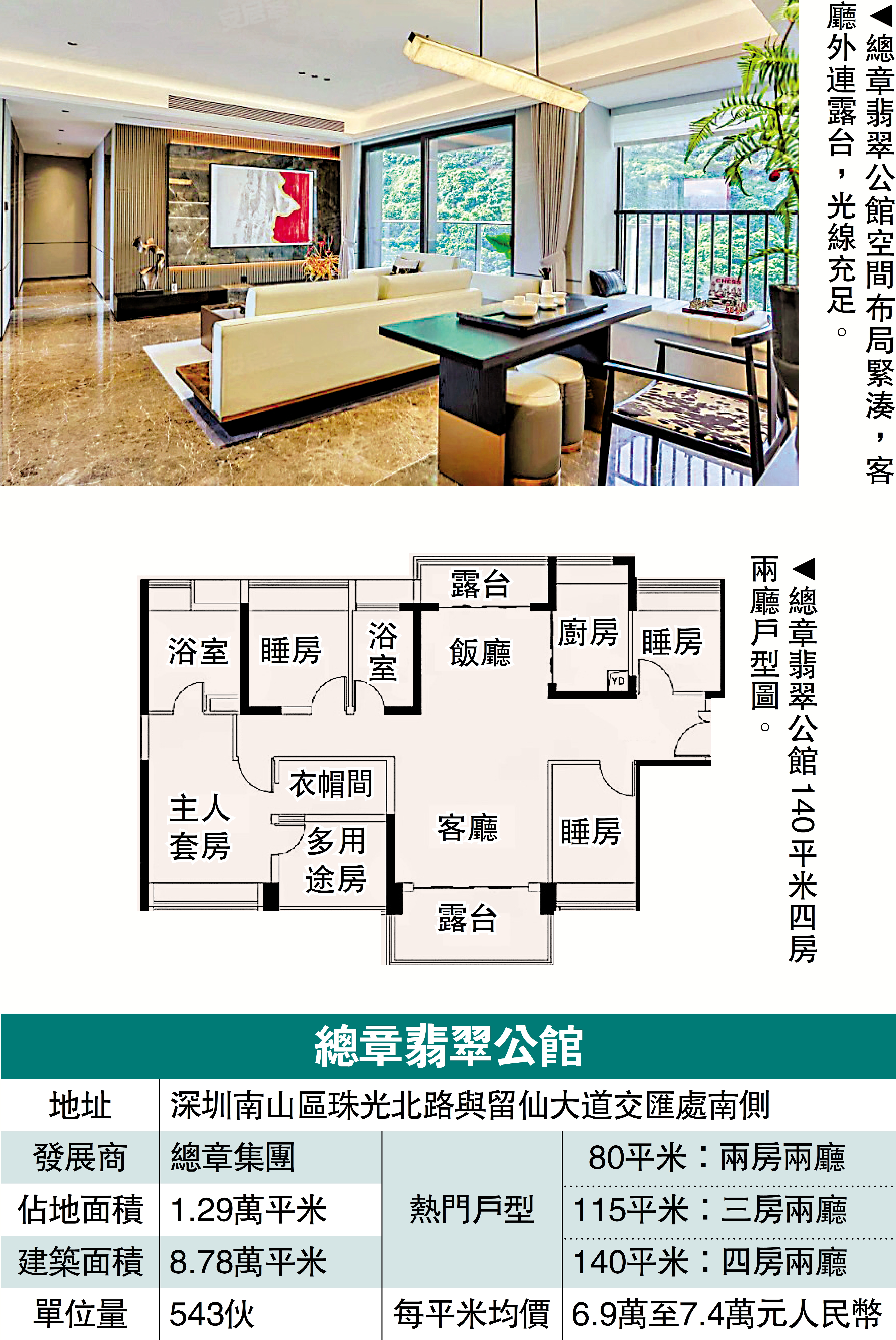 總章翡翠公館共5幢高層住宅,提供543伙,整體規劃合理,營造和諧的社區氛圍,單位戶型多元化,面積由80至140平米,間隔由兩房兩廳至四房兩廳。