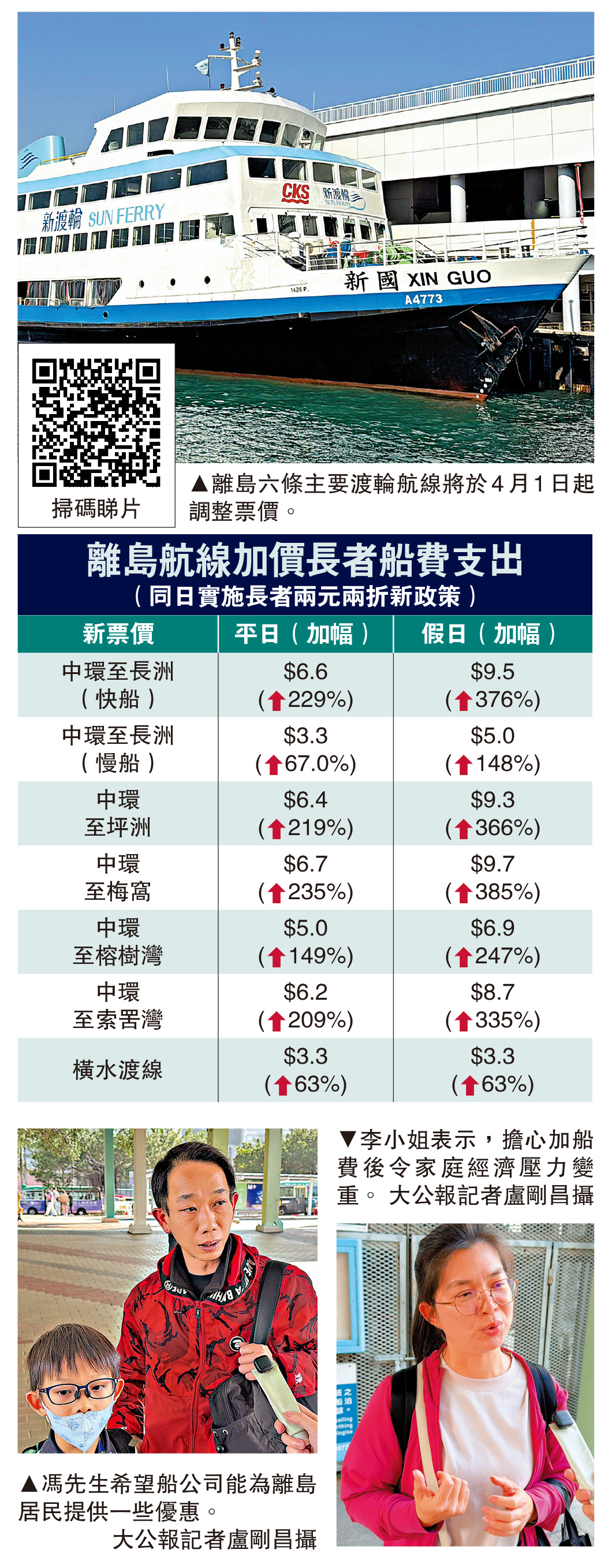 【大公報訊】記者姚棠、盧剛昌報道:離島六條主要渡輪航線4月1日起調整票價,運輸署建議中環來往長洲、榕樹灣、索罟灣及「橫水渡」4線加價12.5%;中環來往梅窩及坪洲兩線,署方建議取消普通船票,與高速船劃一票價;原有的長者2元優惠亦將同時改為「兩元兩折」,故4月起長者乘搭上述離島線船費將大增,各線平日單程貴63%至235%,假日更貴63%至385%,差不多達四倍。有離島區議員建議政府協助船公司拓展非票務收入,減輕經濟壓力,以減緩票價增長速度。