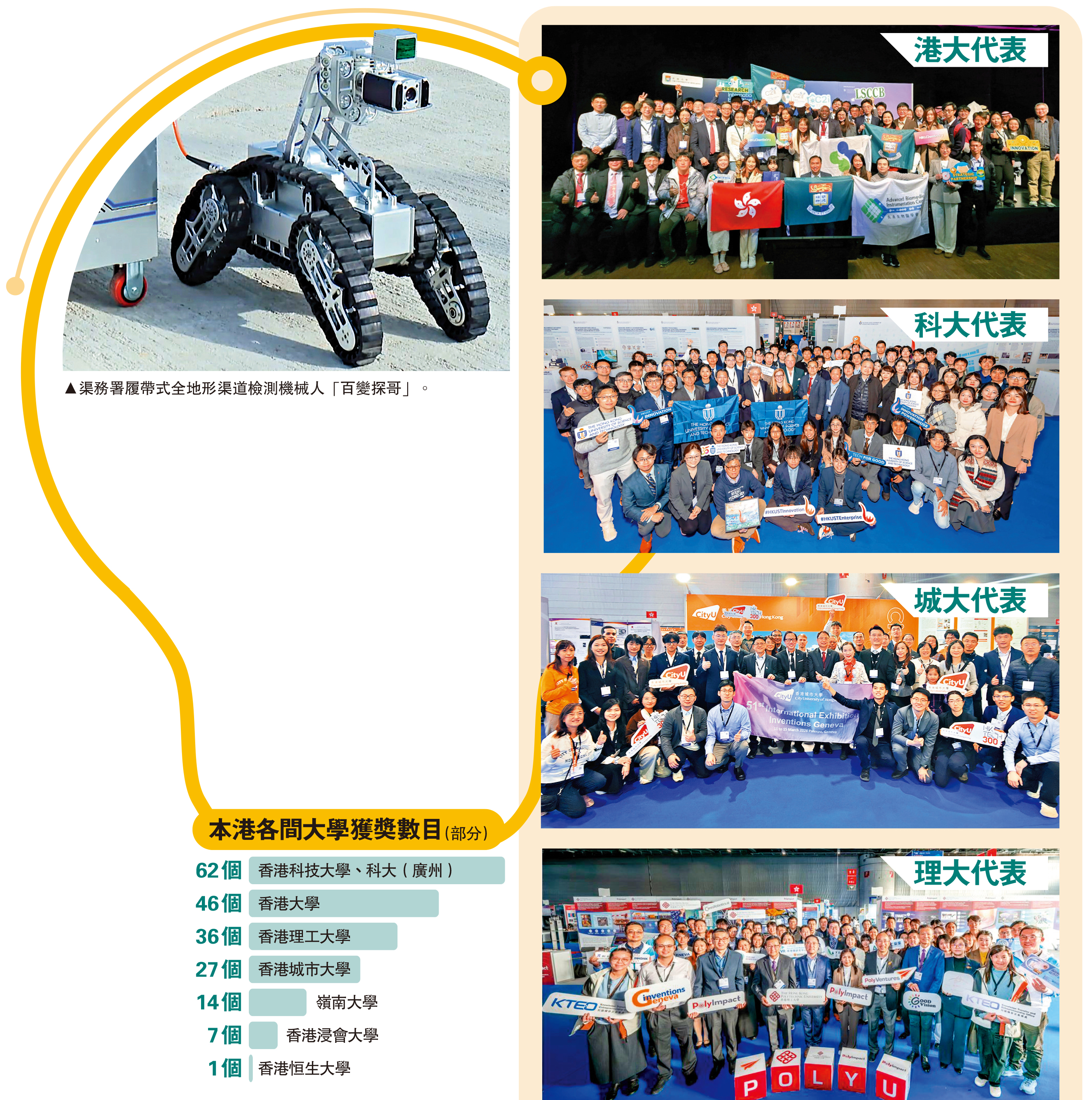 至於發展局及其轄下部門,合共展出36個項目,獲36項獎項,包括一項沙特阿拉伯王國教育部─沙特創新卓越獎、七項評審團嘉許金獎、13項金獎、11項銀獎及四項銅獎,獲獎數目創歷年新高。其中,由渠務署和內地專業團隊共同研發的履帶式全地形渠道檢測機械人「百變探哥」,獲沙特阿拉伯王國教育部─沙特創新卓越獎,為政府部門首獲該獎。該機械人可在複雜地形中穩定運行,並全面採集視覺與空間數據,或搭載傳感器收集其他數據。相關數據會上傳至AI評估平台,實時分析並快速生成檢測報告。發展局局長甯漢豪指,發展局得獎項目不但提升公共服務的質素和效率,也可作出示範、推動業界更廣泛應用創新科技,打造香港成為國際基建中心。至於機電工程署則獲得多個金獎,包括用於密閉空間監測的機械狗隊。