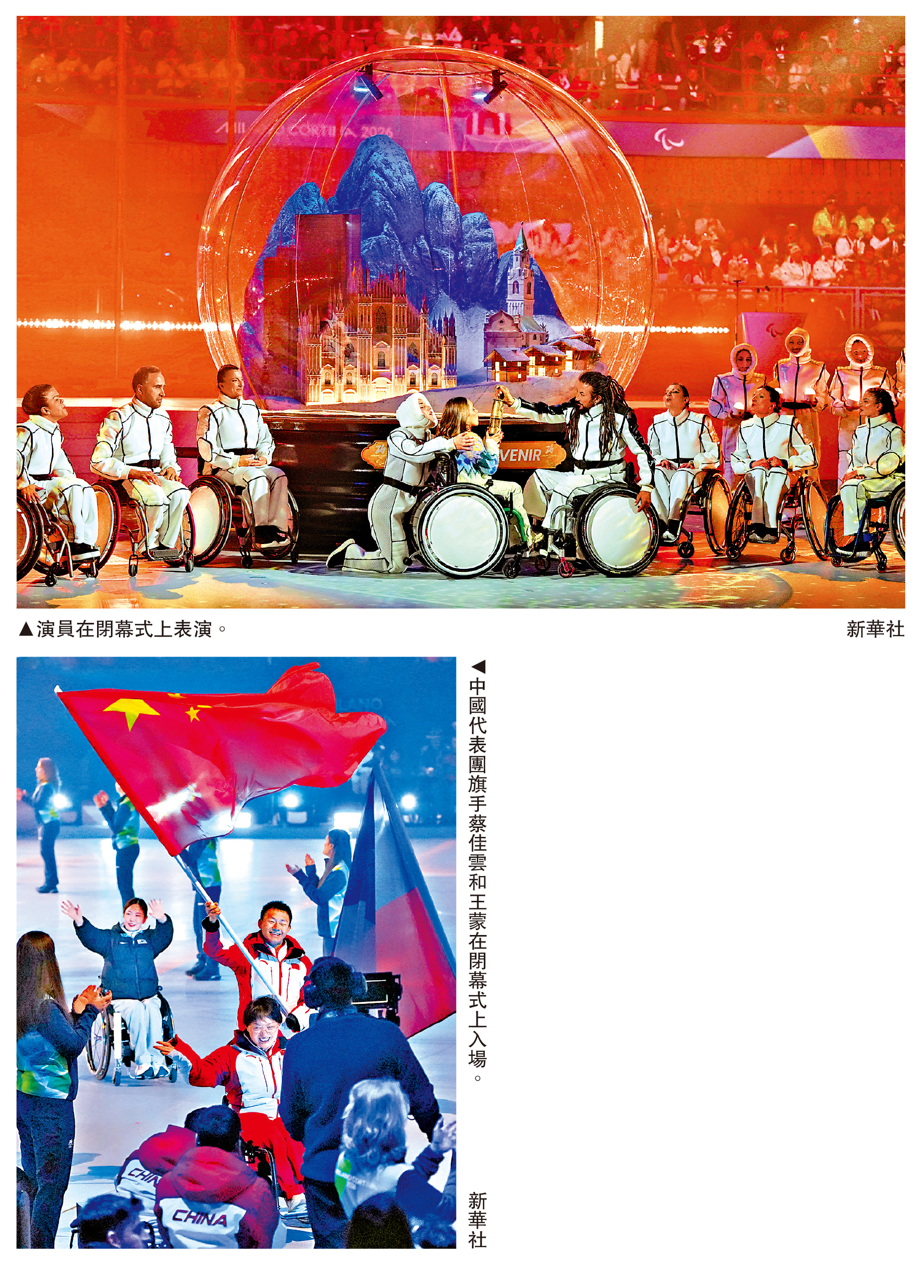 在帕森斯宣布米蘭─科爾蒂納冬殘奧閉幕後,一個巨大的水晶球模型被推進舞台中央。水晶球中,本屆冬殘奧舉辦地的地標建築和雪山盛景一覽無餘,這是意大利送給所有賽事參與者的珍貴「伴手禮」。