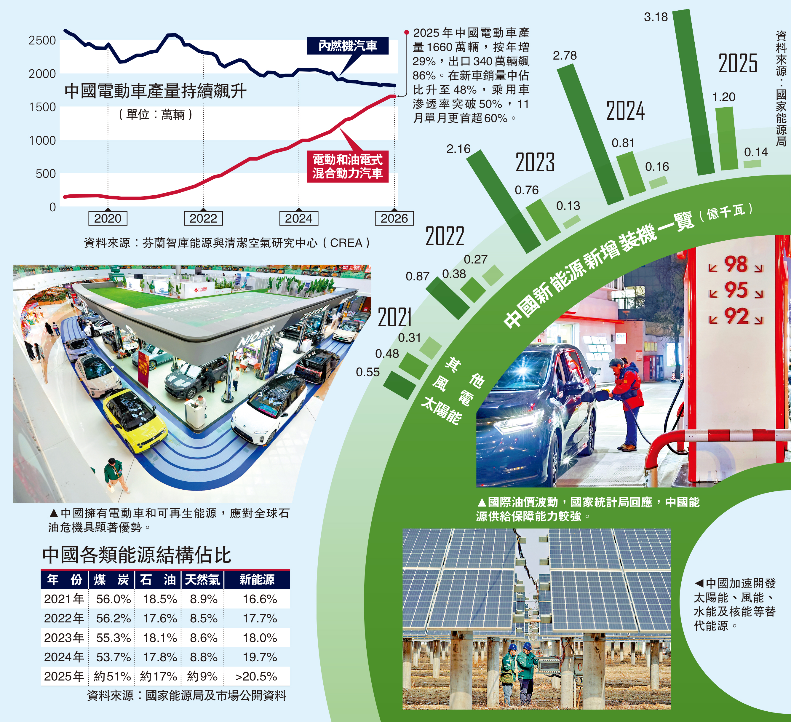 2026年全國兩會期間,「未來能源」首次寫入《政府工作報告》,成為國家能源戰略的重要方向。多位海外能源專家指出,中國擁有「電動車」和「可再生能源」,在應對全球石油危機時具備顯著競爭優勢。其中,中國加速開發太陽能、風能、水能及核能等替代能源,逐步降低對外國能源的依賴,相比其他國家,中國擁有更大的緩衝空間。\大公報記者 李耀華