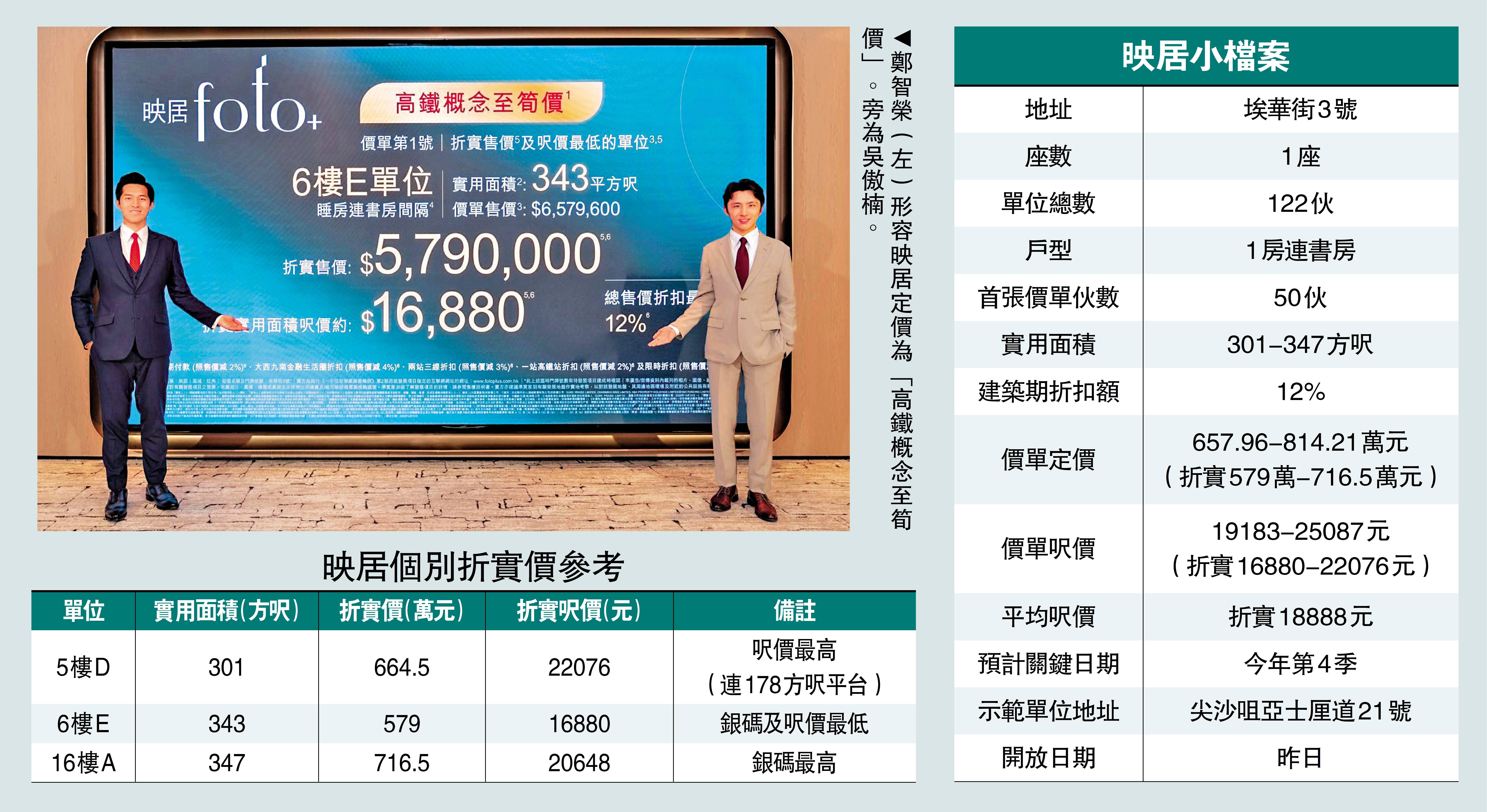 有新盤於樓市大旺時逆市低開。建灝夥市建局合作的旺角映居,首推50伙折實平均呎價18888元,較同區同類一手低開逾20%,折實579萬元起。針對近日的大手掃貨潮,引入大手現金回贈優惠,最多為合約價的2.25%。周五收票最快下周開賣。\大公報記者 梁穎賢