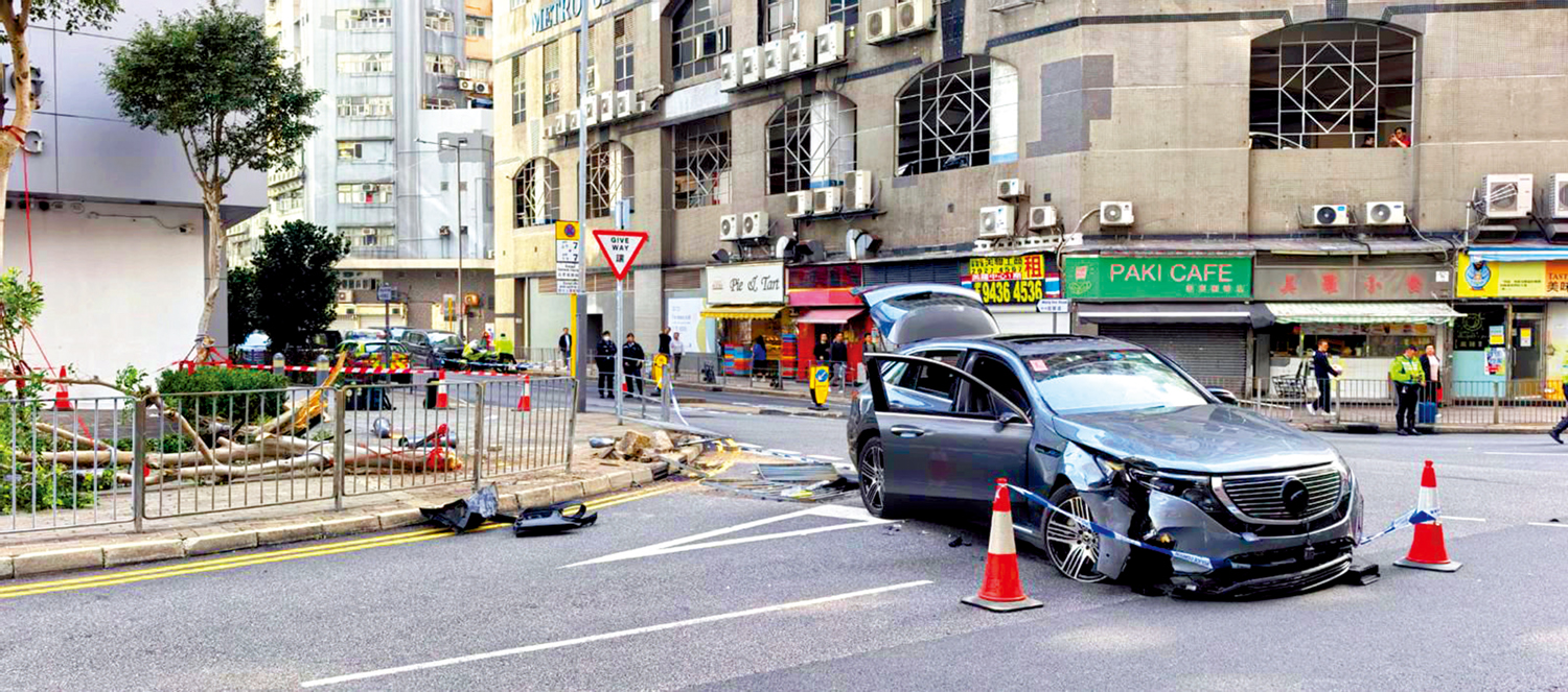 事故發生在臨興街香港大學附屬學院李韶伉儷樓對開的行人路。現場可見,一輛掛有粵港車牌的銀灰色平治電動車橫停在馬路中,右前側嚴重損毀,保險蓋脫落。有路邊護欄被連根抽起,帶飛地上磚泥碎裂後散落一地,有樹木被腰斬,可見事發時衝擊力之大。警方初步調查相信,事發在昨午12點40分,肇事司機於美羅中心停車場外掉頭,其間誤將油門當成煞車掣,引致車輛失控。九名傷者年齡介乎18至75歲,傷勢最嚴重的是75歲女乘客,目前情況稍為穩定,仍在留院觀察和治療。其餘傷者均輕傷並清醒,身體有不同程度擦撞傷。