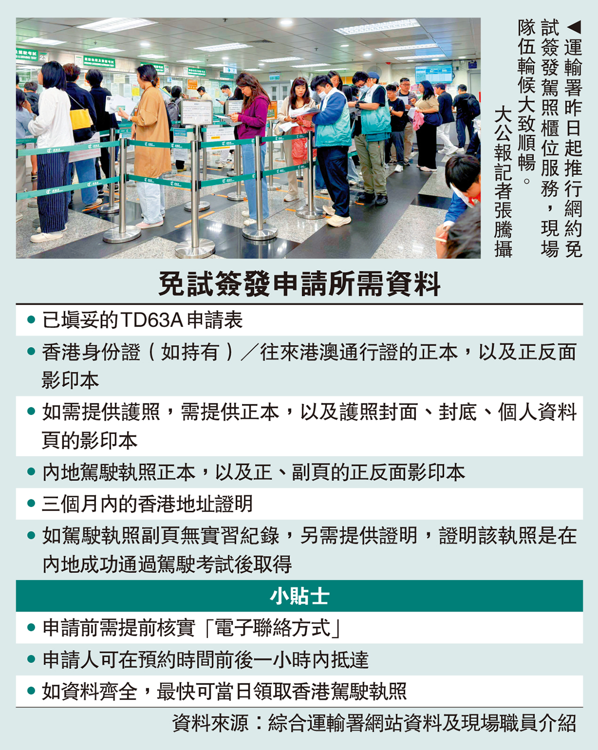 運輸署昨日起全面推行網上預約免試簽發香港正式駕駛執照櫃位服務,大公報記者昨日前往九龍牌照事務處實測申請流程,發現不少申請人因未能即場交齊影印資料而須重新排隊,亦有申請人到場後才知悉若所持的內地駕駛執照未列明實習期須另外提交證明資料。