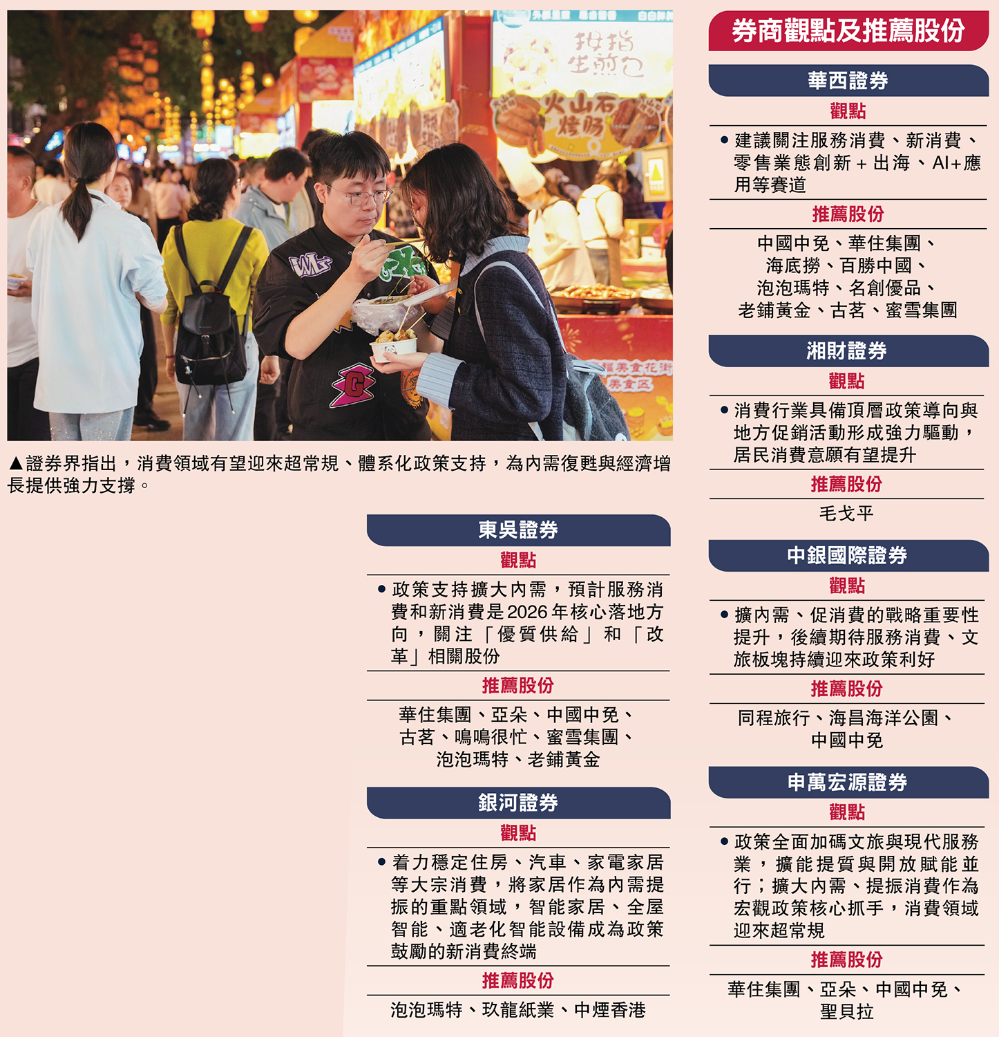 2026年政府工作報告亮點紛呈,其間面向消費領域有相當多着墨之處,包括安排規模達2500億元人民幣的超長期特別國債,以支持消費品以舊換新,設立1000億元人民幣財政金融協同促內需專項資金。湘財證券指出,政府工作報告提出深入實施提振消費專項行動,預期活躍線下消費、激發下沉市場消費活力,將具有明確政策導向性。東吳證券相信,政策支持擴大內需,服務消費、新消費有望是今年核心落地方向。政策大方向下,投資者不妨在消費板塊發掘受益股份。\大公報記者 劉鑛豪