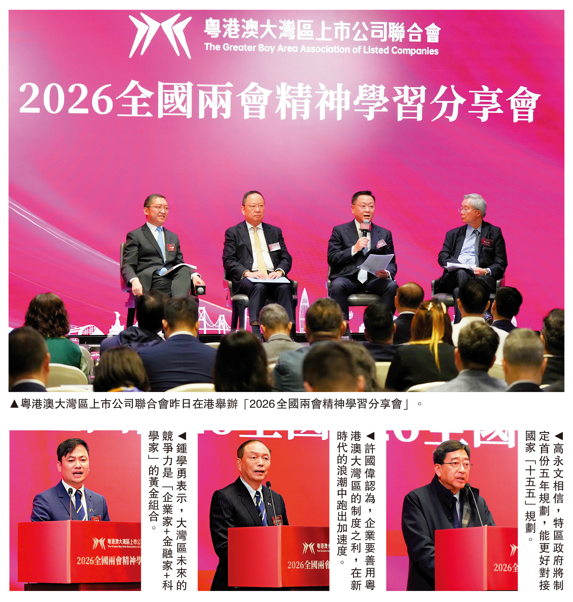 為深入貫徹落實全國兩會精神,把握時代發展的風向標,激發粵港澳大灣區高質量發展的活力,由粵港澳大灣區上市公司聯合會主辦的2026全國兩會精神學習分享會昨日在港舉行。活動吸引逾150位嘉賓出席。