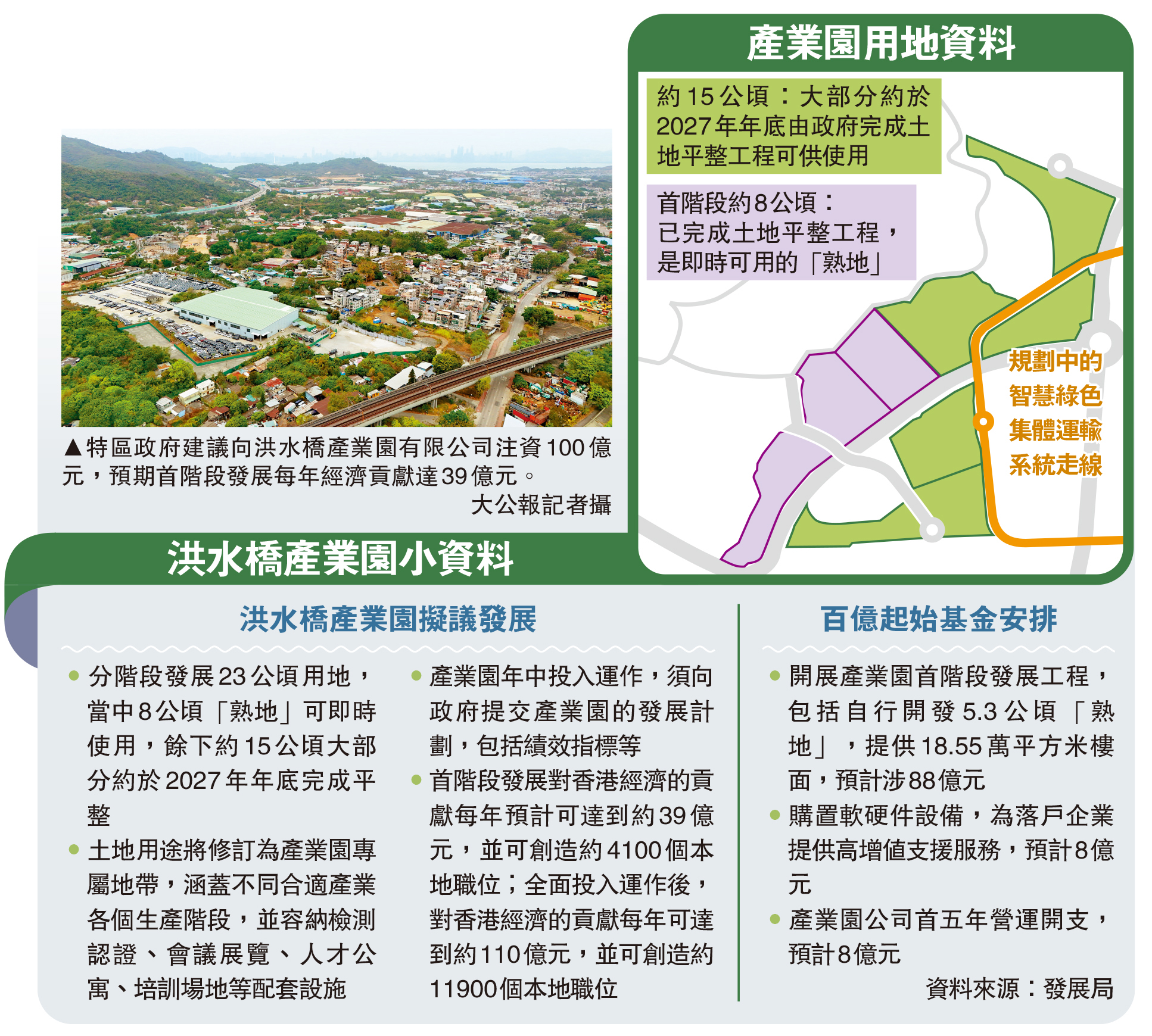 【大公報訊】記者鄭文迪、易曉彤報道:特區政府建議向洪水橋產業園有限公司注資100億元,支持產業園公司初期營運和發展需要。發展局昨日向立法會交代注資用途,並提到初步研究及市場意向顯示,落戶園區的產業包括高增值或智能化生產、先進建造業等,預期首階段發展每年經濟貢獻可達39億元、創造約4100個本地職位,全面投入運作後每年經濟貢獻可達110億元,並可創造約1.19萬個本地職位。產業園公司預計今年中投入運作,日後須提交績效指標等發展計劃,確保用好政府注資。