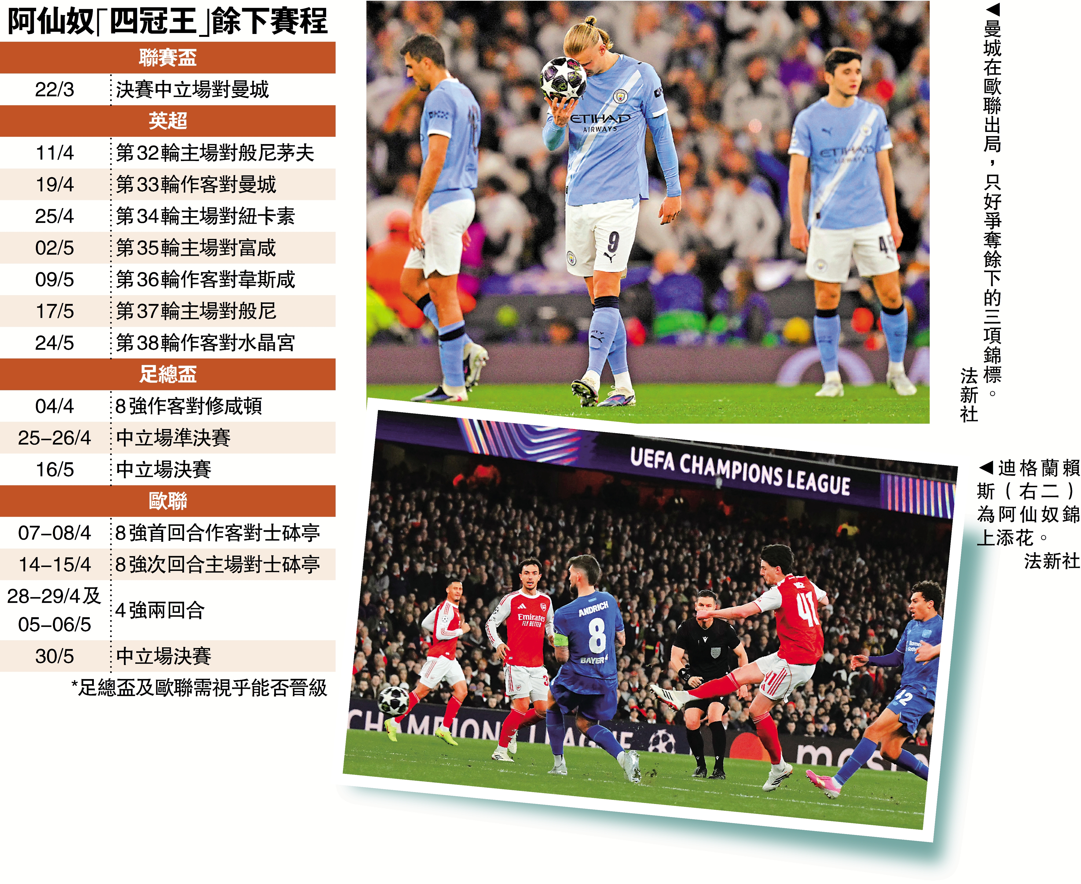 原本亦有機會爭「四冠」的曼城率先在歐聯倒下,英超少踢1場但落後阿仙奴9分,近5仗僅1勝的頹勢下若周日又爭標失敗的話,餘下希望就只有足總盃。主帥哥迪奧拿笑對出局,皆因自言球隊「前景亮麗」,他說:「所有人都想炒掉我,有一天我亦始終會說再見,不過我仍有1年合約;球隊未來一片光明,而來季我們必將回來。」