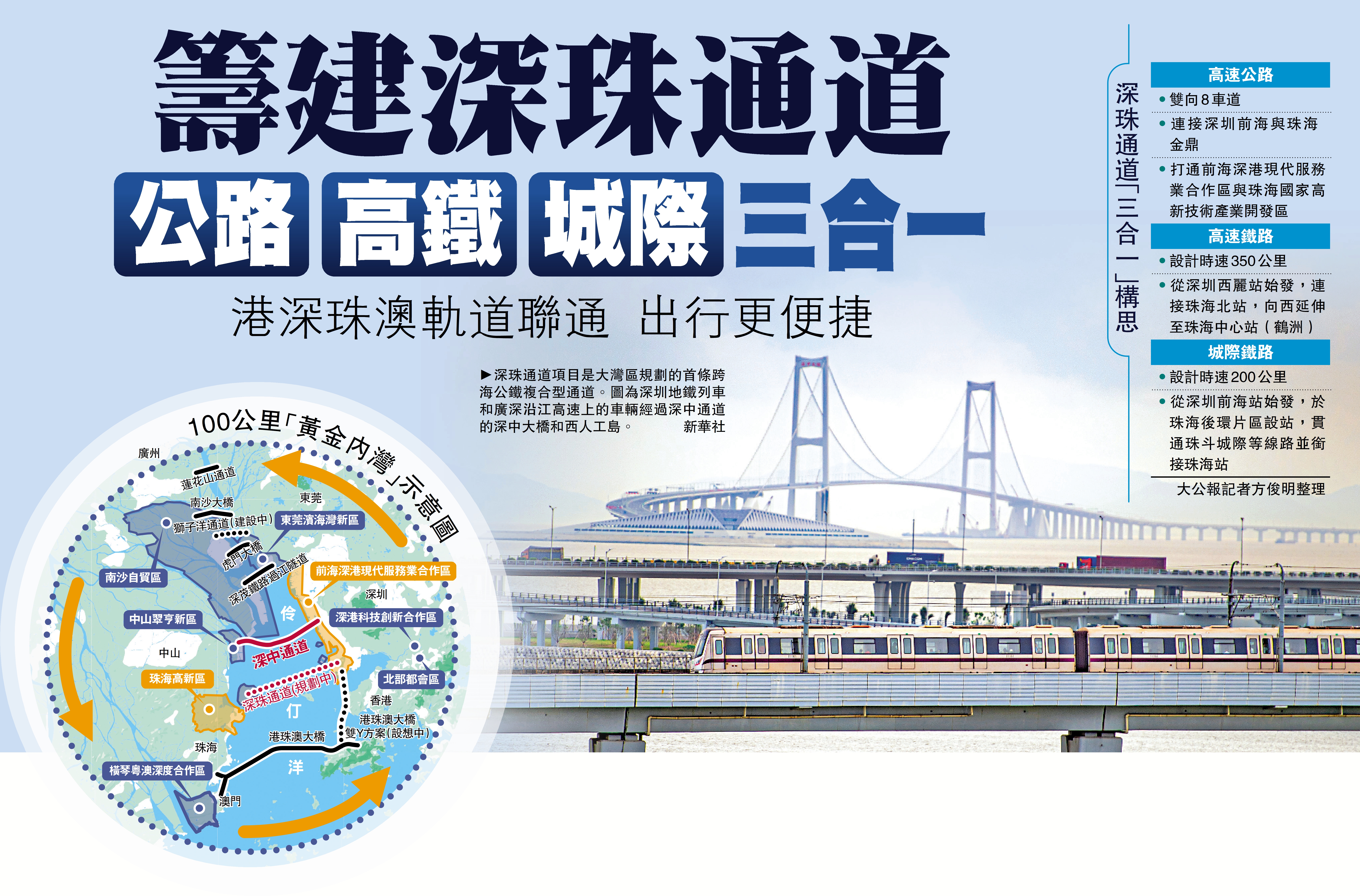 目前,大灣區已有6條跨江跨海通道建成通車,建設連接深圳至珠海的快速越海通道,有助支持港澳更好融入和服務國家發展大局。\大公報記者 方俊明