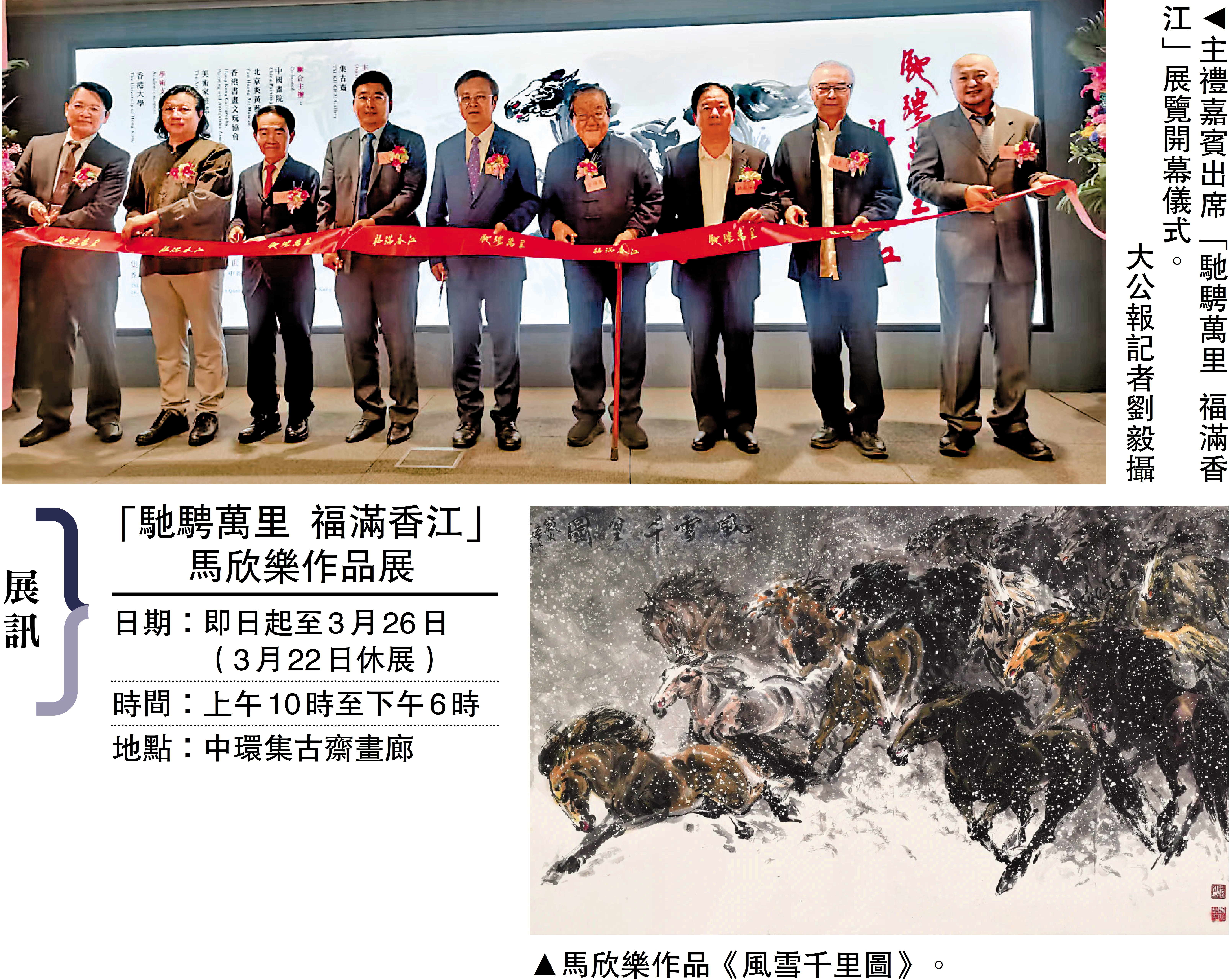 【大公報訊】記者劉毅報道:今年是丙午馬年,由集古齋主辦的「馳騁萬里 福滿香江─馬欣樂作品展」在中環集古齋畫廊舉行,展覽展出畫家馬欣樂創作的50餘件駿馬、花鳥、風景題材繪畫作品,作品中的馬姿態矯健,於中國傳統水墨基礎之上展示意志和力量。展覽為馬欣樂在香港的首個個展,展期至3月26日。