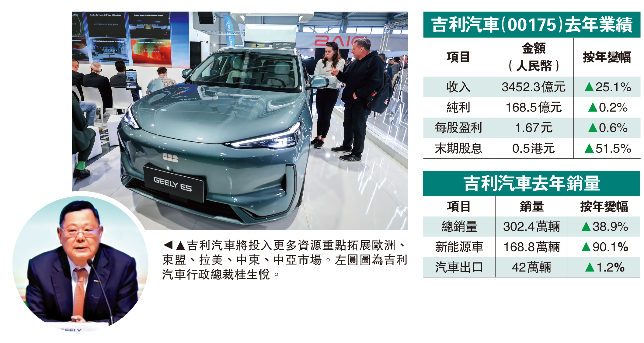 吉利汽車(00175)公布去年成績表,股東應佔利潤168.5億元(人民幣,下同),按年微升0.2%,末期股息0.5港元,按年多派51.5%。去年銷量升38.9%至302.4萬輛,出口由41.5萬增至42萬輛,其中新能源車出口大升近2.4倍。執行董事淦家閱表示,今年銷售目標為345萬輛,將投入更多資源在國際業務,重點拓展歐洲、東盟、拉美、中東、中亞市場,出口目標為64萬輛,但他又指內部訂下目標為75萬輛。\大公報記者 李永青