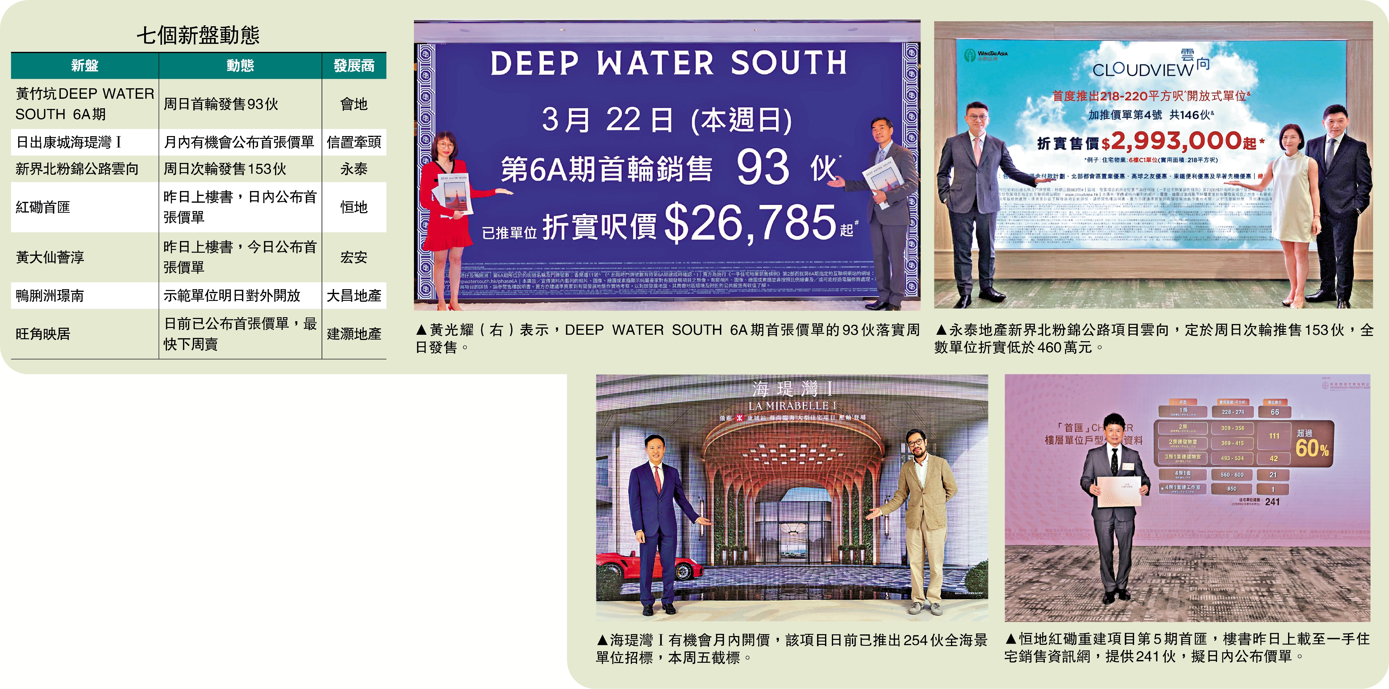 一手市場戰況激烈,7個新盤上演大混戰,其中,本周日將有兩盤同時推售,合共246伙。會地夥港鐵的黃竹坑上蓋港島南岸DEEP WATER SOUTH 6A期,落實於周日首輪推售93伙,而永泰地產新界北粉錦公路雲向,亦不約而同鐵定於周日次輪推售153伙;同屬港鐵項目,由信置牽頭的日出康城海瑅灣Ⅰ,預告月內公布首張價單;另邊廂,恒地紅磡首匯及宏安地產黃大仙薈淳,昨日同步上載樓書,分別於明日及今日開價。\大公報記者 梁穎賢