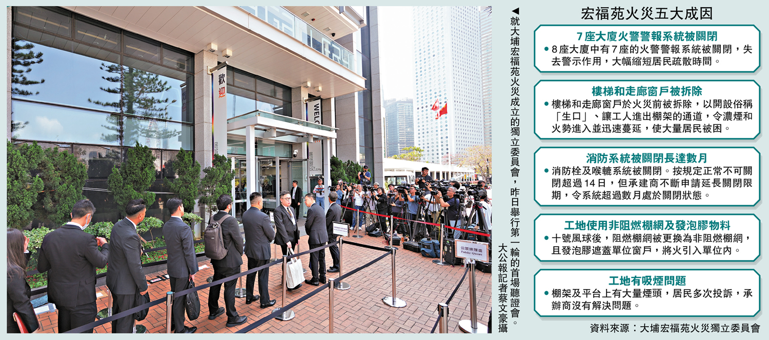 特區政府就大埔宏福苑火災成立的獨立委員會,昨日舉行首場聽證會。委員會代表資深大律師杜淦堃開場陳詞表示,委員會收到超過100萬份檔案,概括大火成災的五大因素,初步鎖定起火原因是有人燃點香煙,而大廈的消防設施在大火時幾乎全部失效,加上棚網並非阻燃棚網,以及住宅單位窗戶被發泡膠遮蓋,將火災引入單位內。